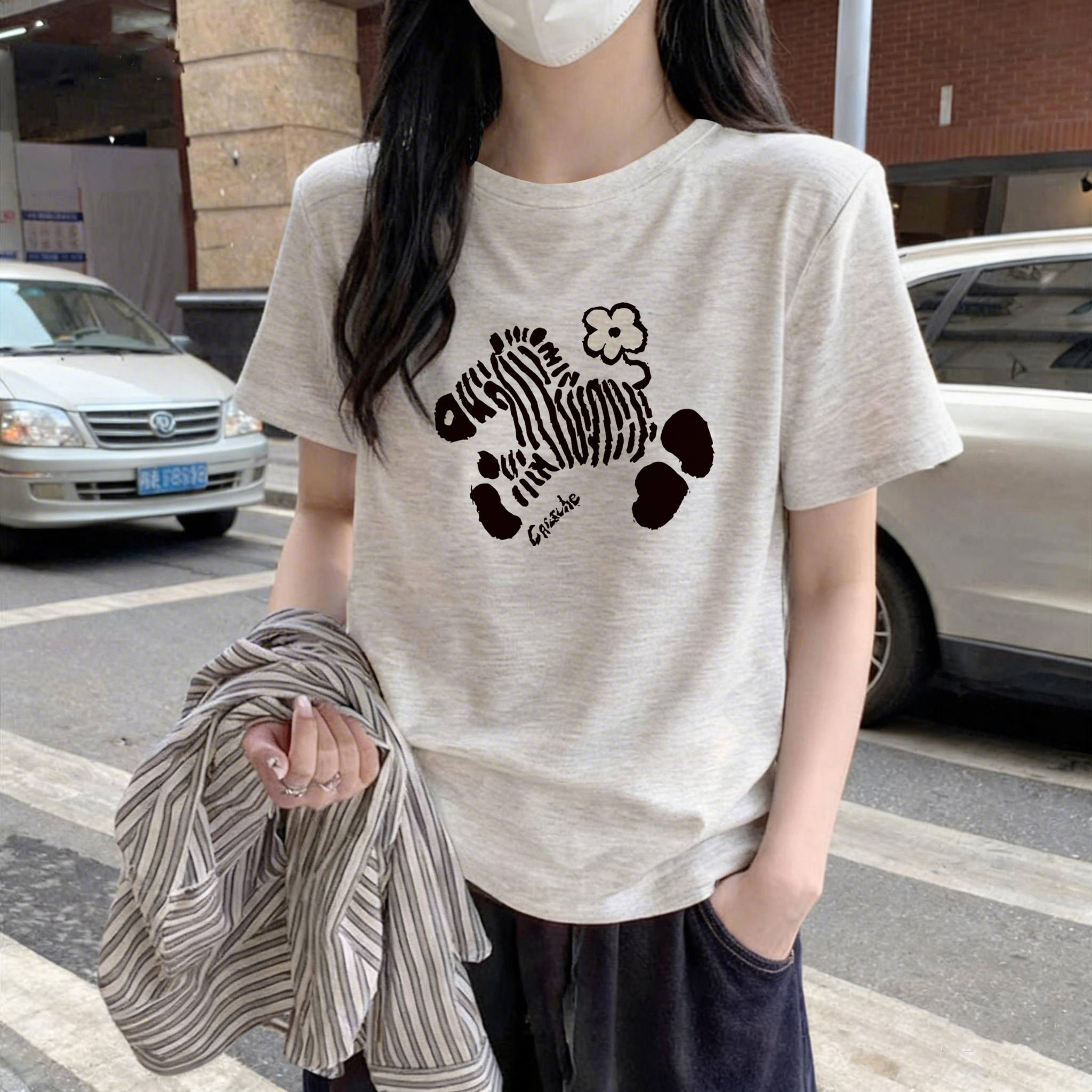 正肩短袖t恤女款2026新款夏天穿搭大码女装胖mm圆领薄款灰色上衣