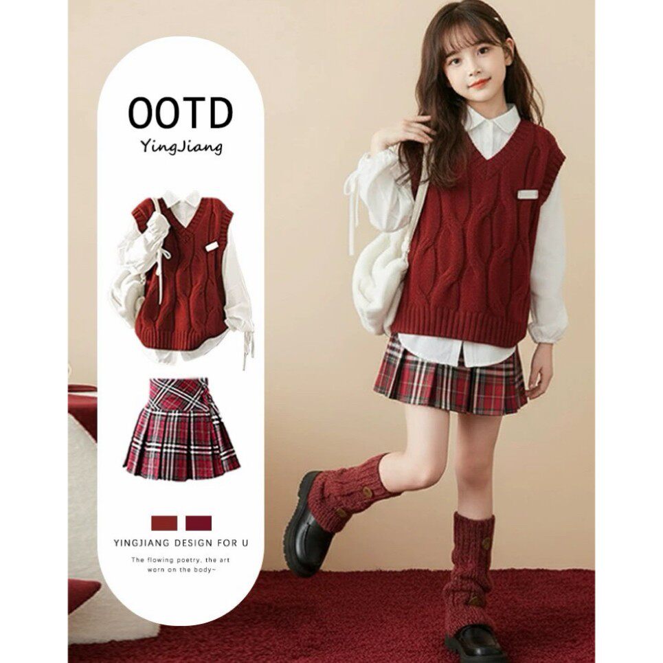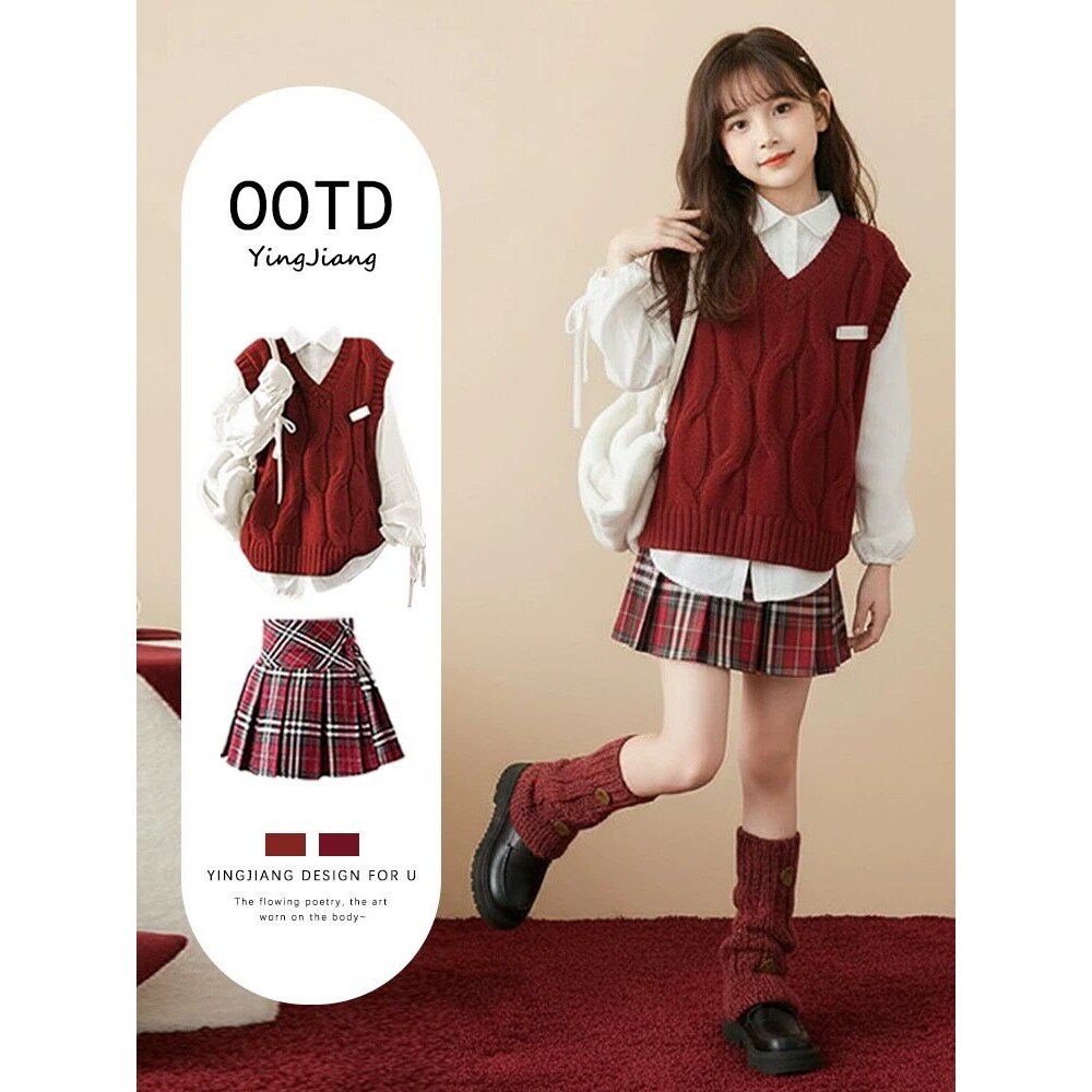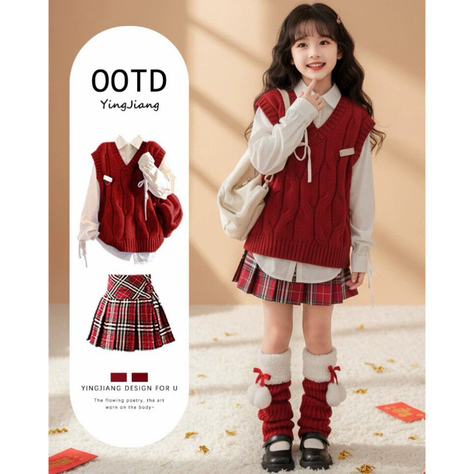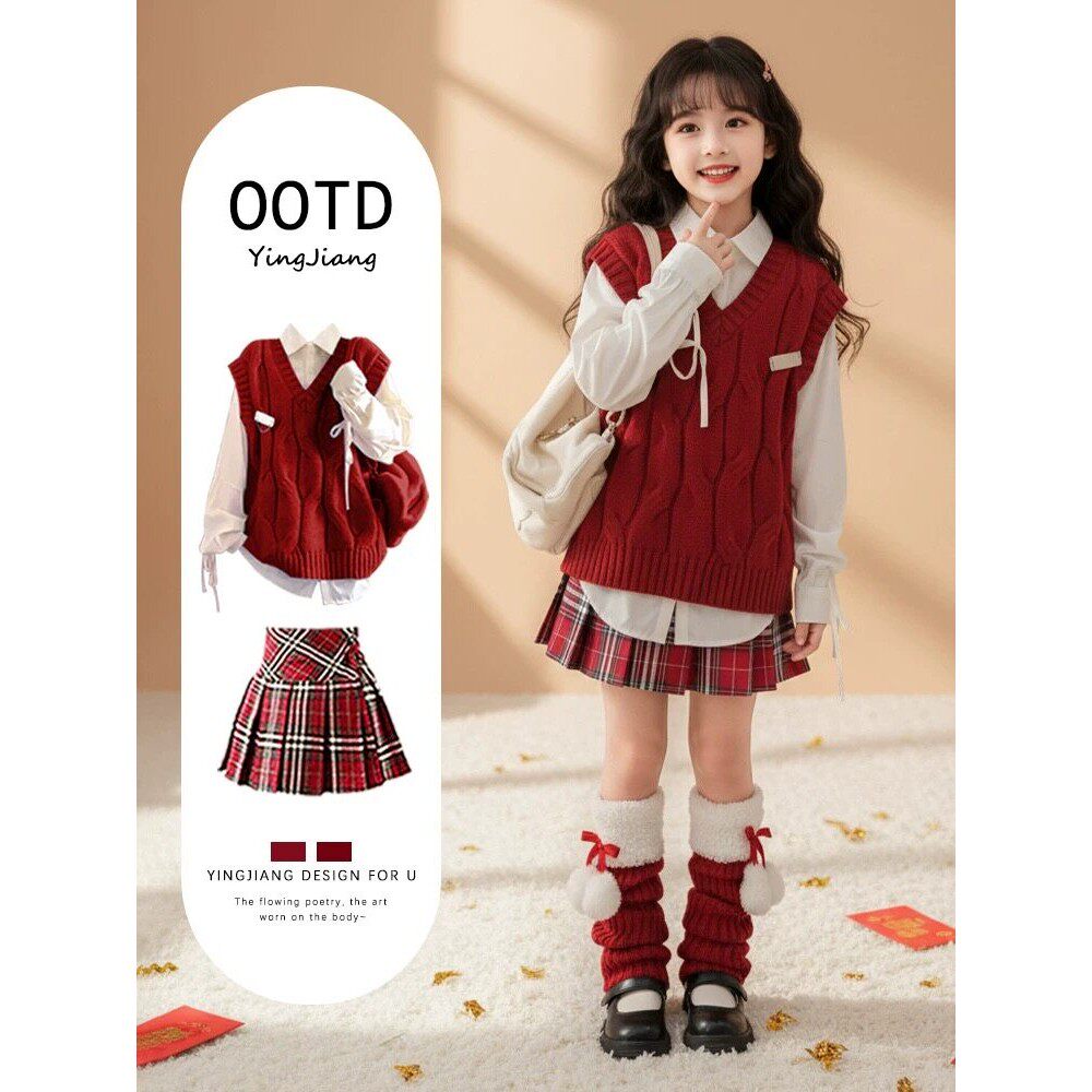 女童冬装红色毛衣套装中大童秋冬季衬衫半身裙子儿童拜年服装童装