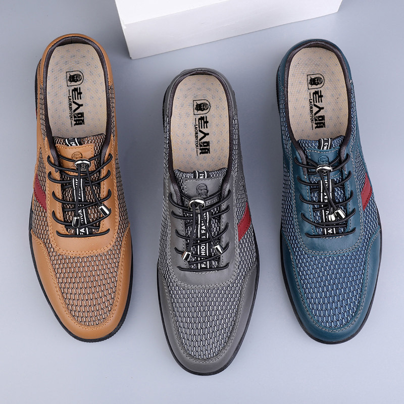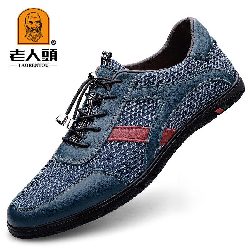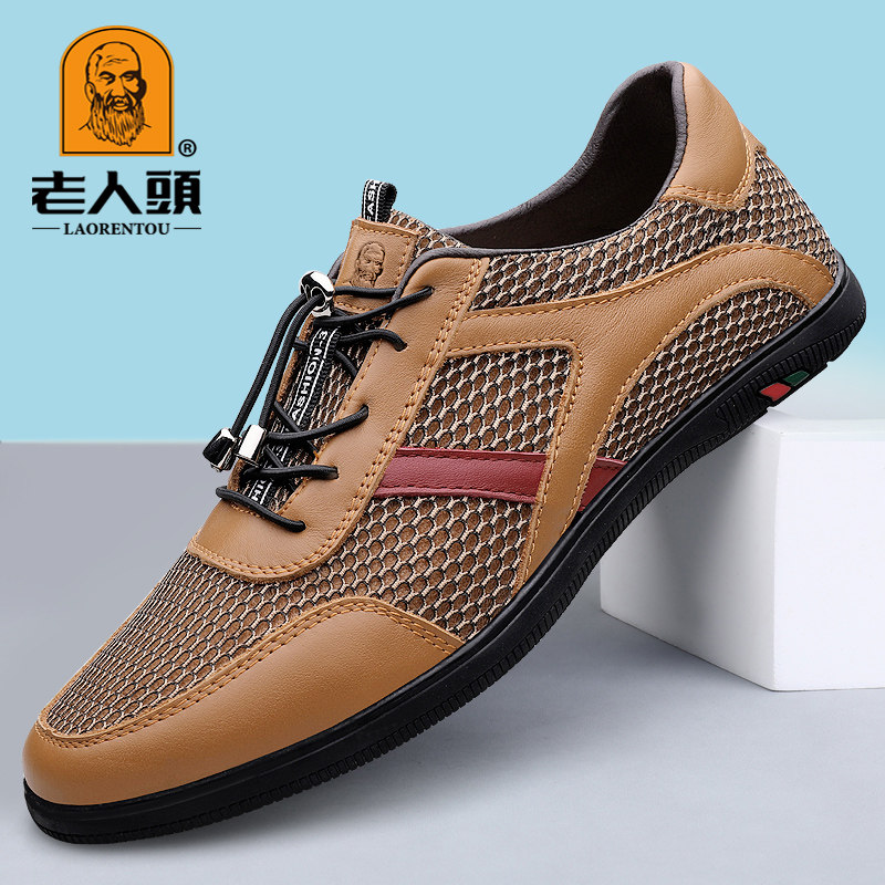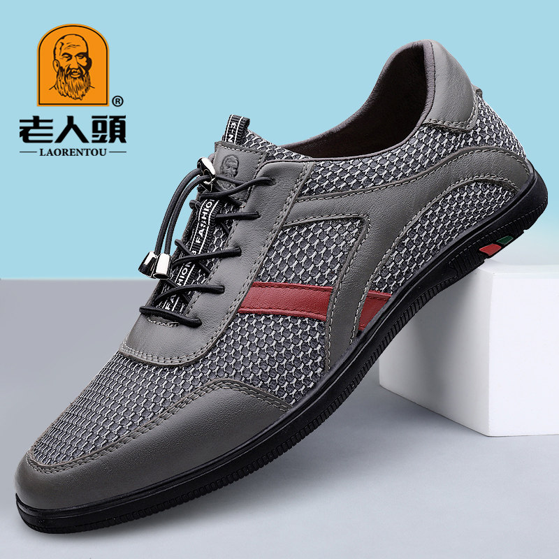 老人头夏季薄款防臭网面男鞋休闲透气散步鞋真皮软底运动鞋网眼鞋