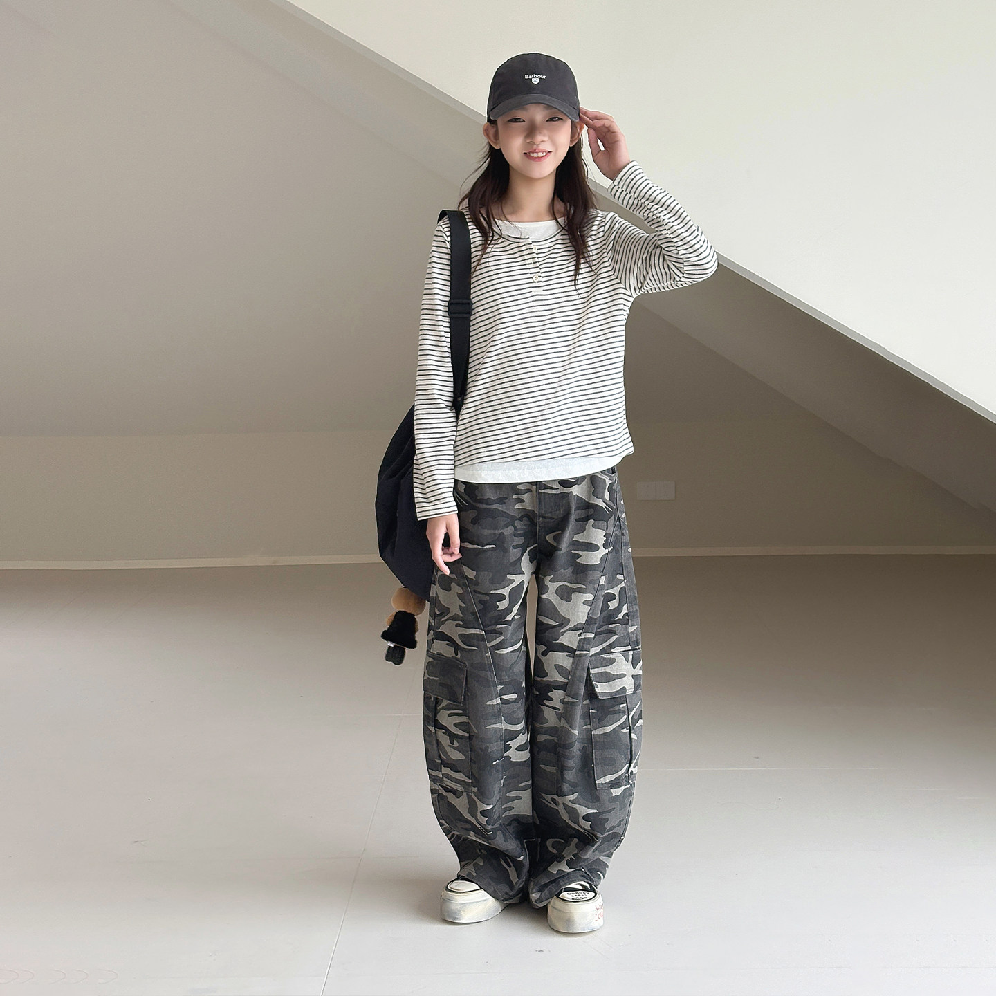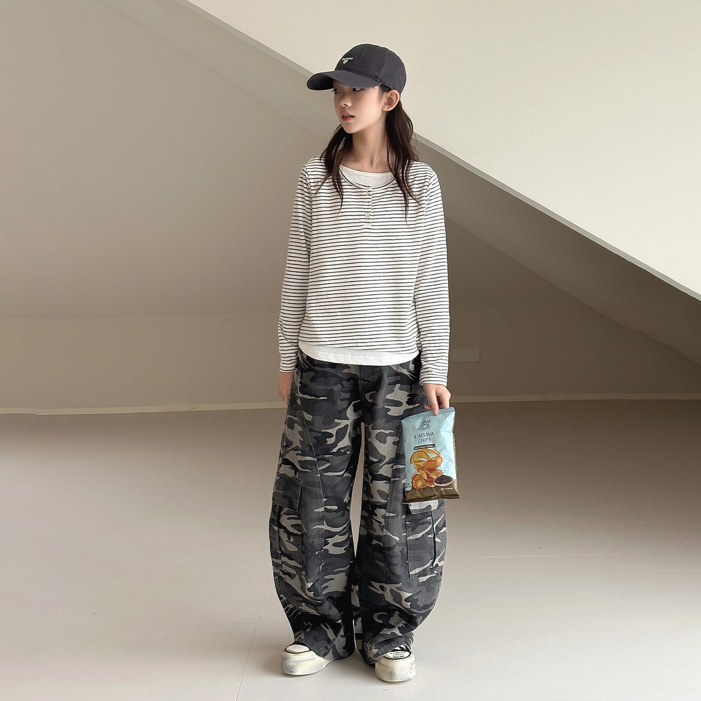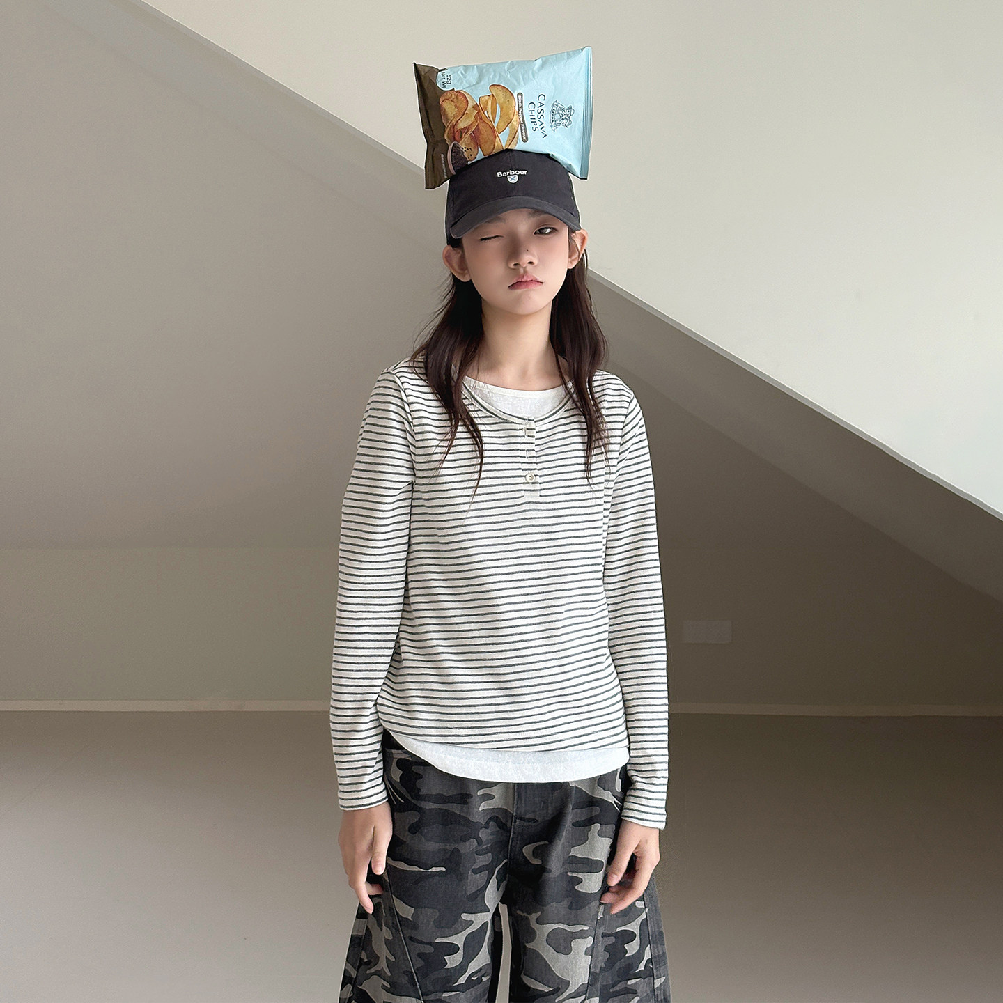 【舒适区】初中生女假两件T恤2026春装新款青少年亨利领条纹上衣