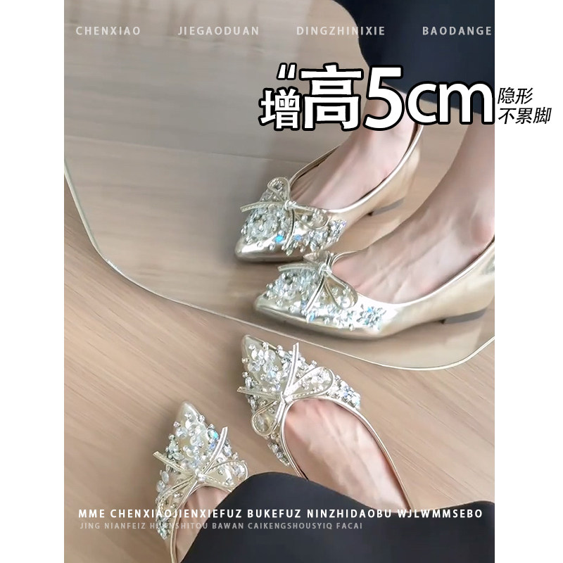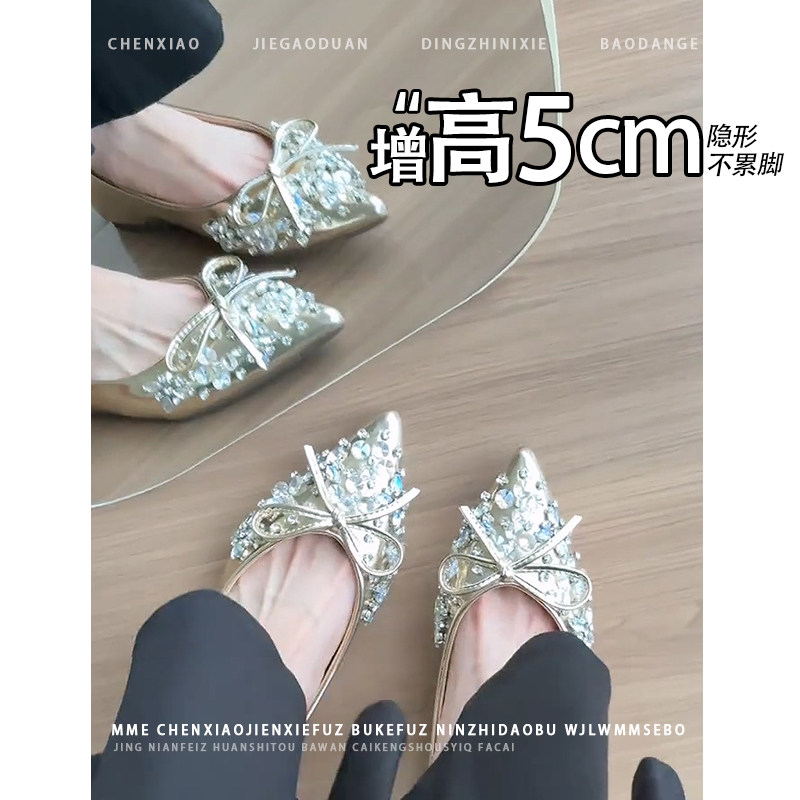 不累脚!小个子内增高5CM玛丽珍鞋2026秋尖头水钻蝴蝶结浅口单鞋