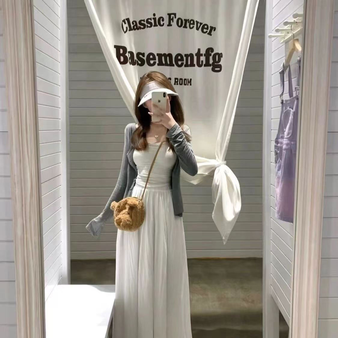 小个子穿搭白色吊带连衣裙女早春季2024新款海边度假沙滩长裙套装