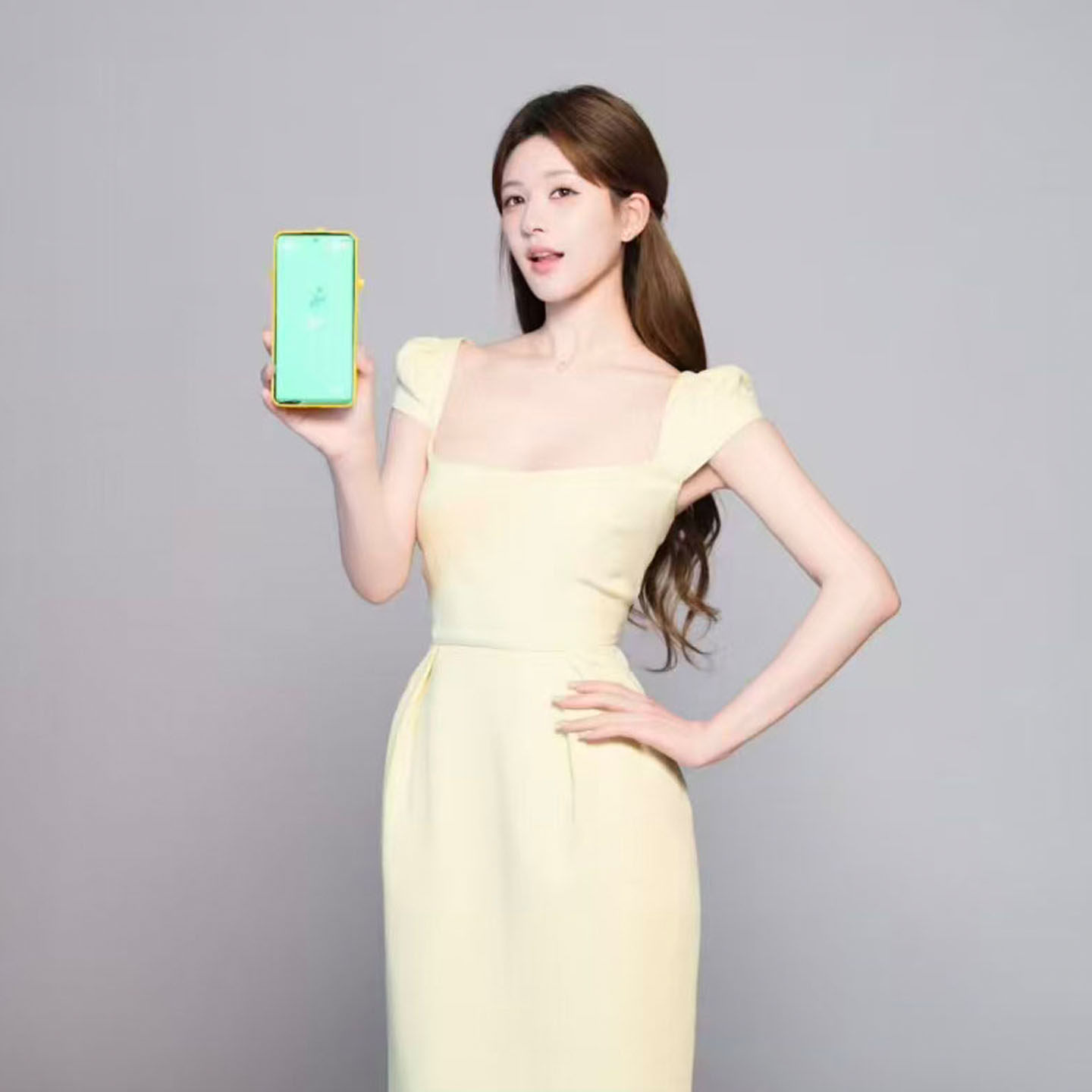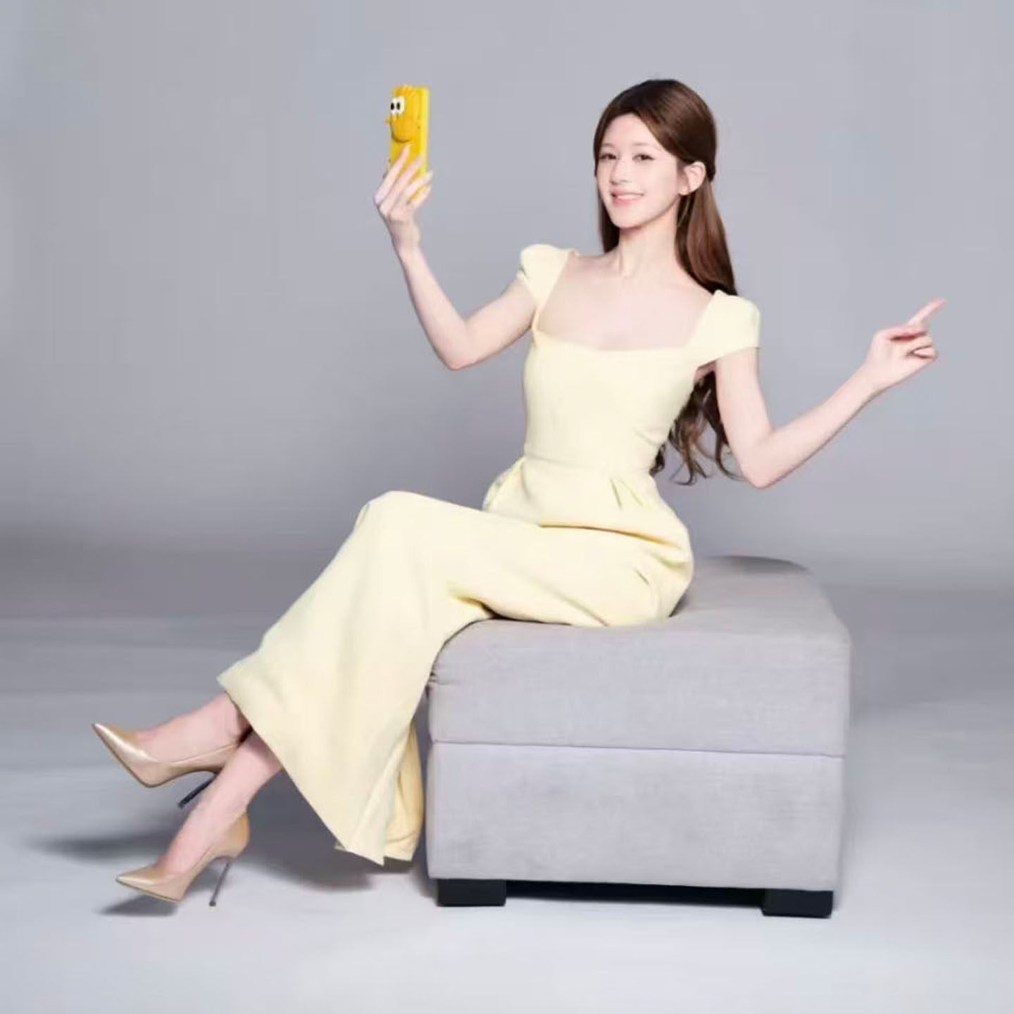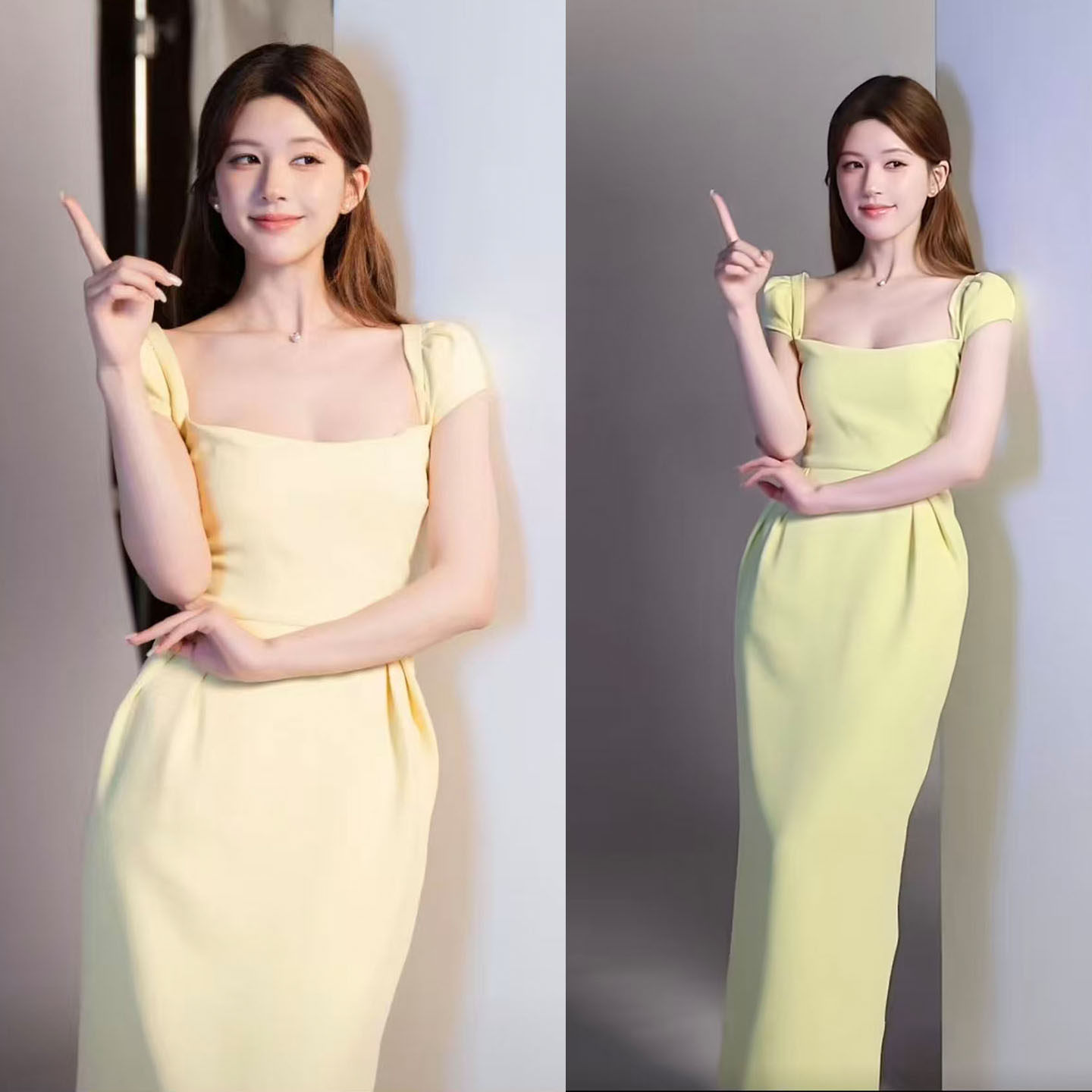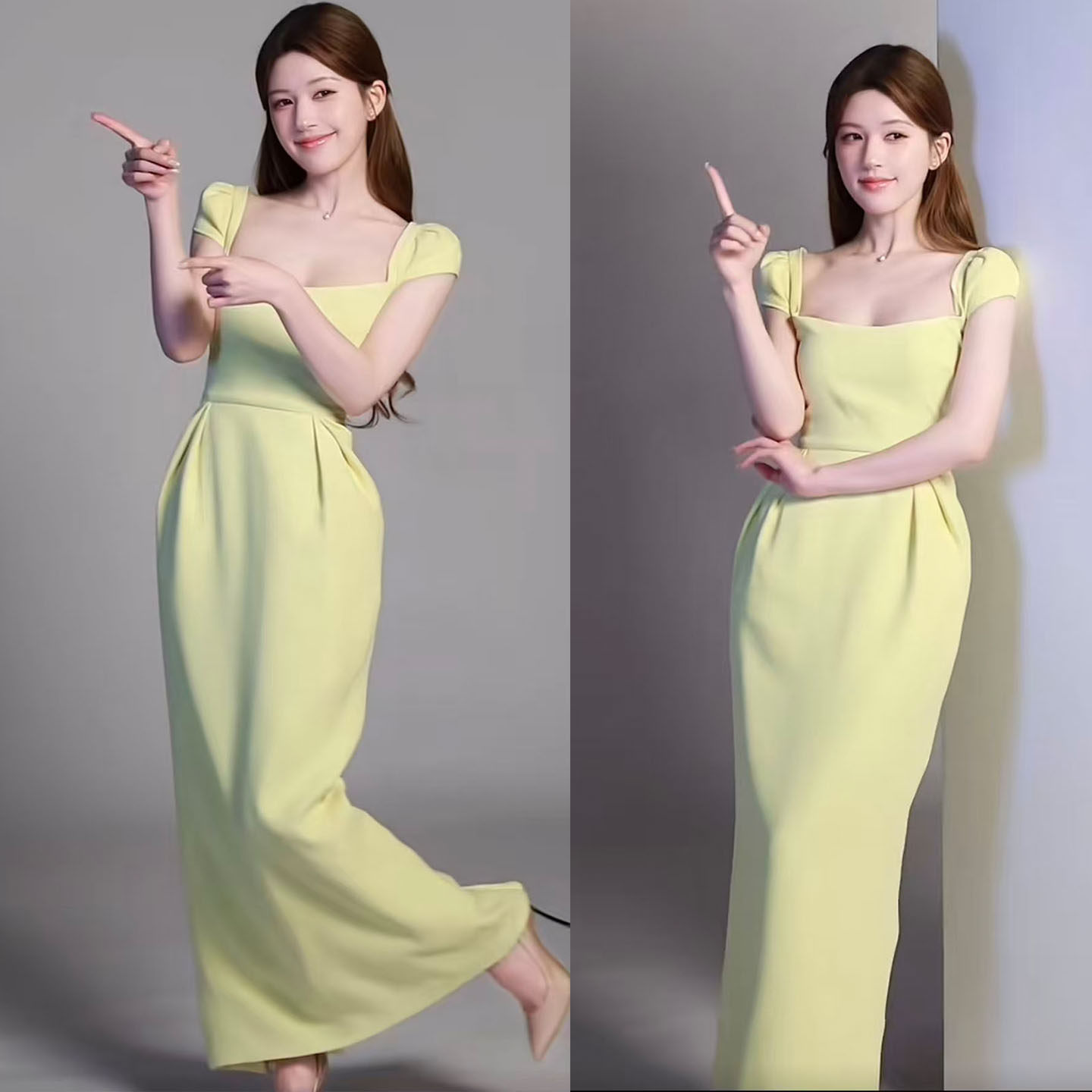 赵露思同款黄色方领短袖长款连衣裙女2026新款法式掐腰巨好看长裙