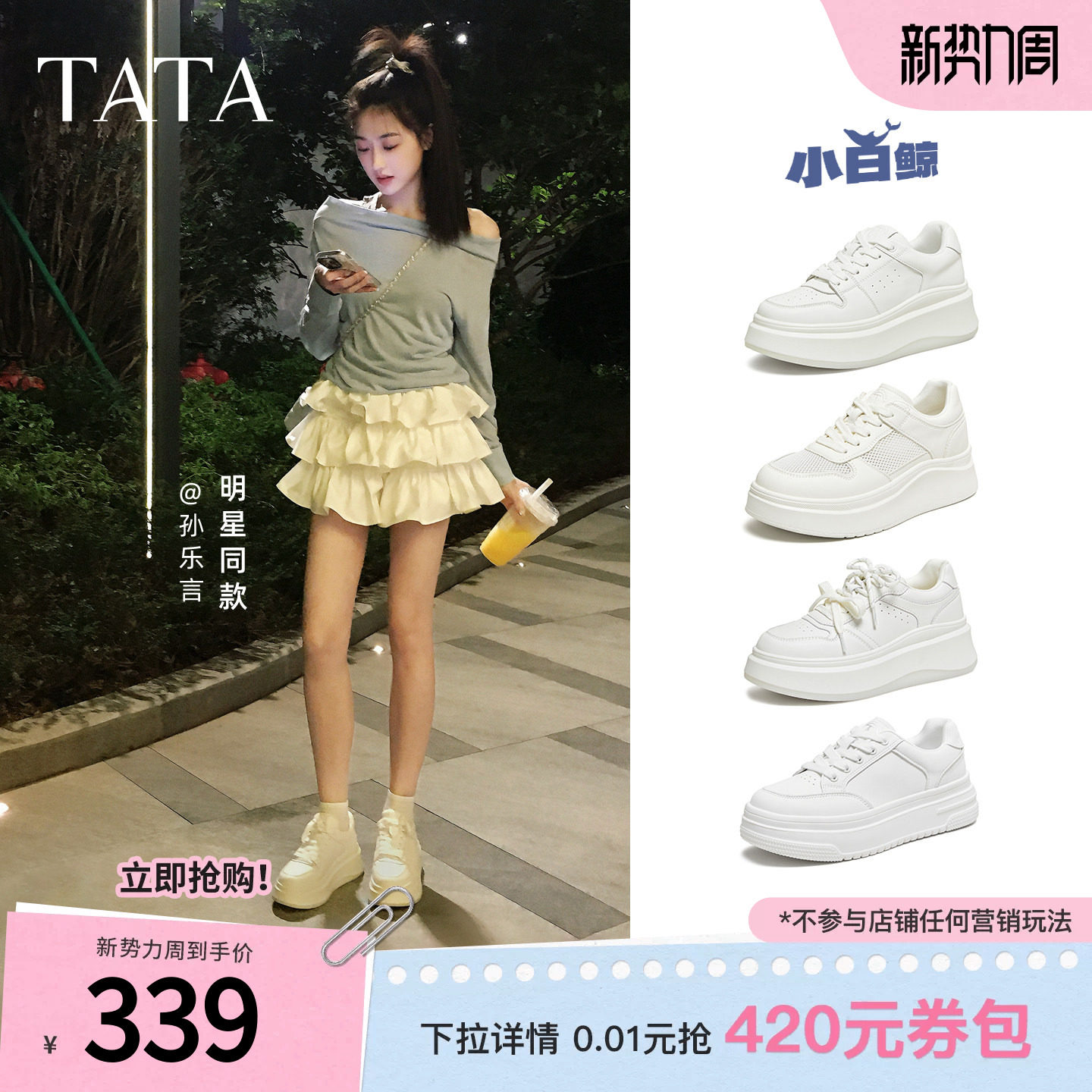 孙乐言同款TATA他她女鞋小白鲸板鞋厚底百搭鞋子增高休闲款学生鞋