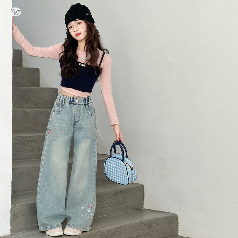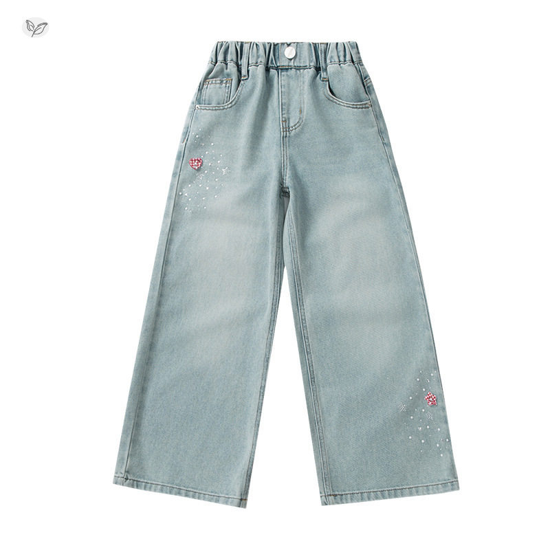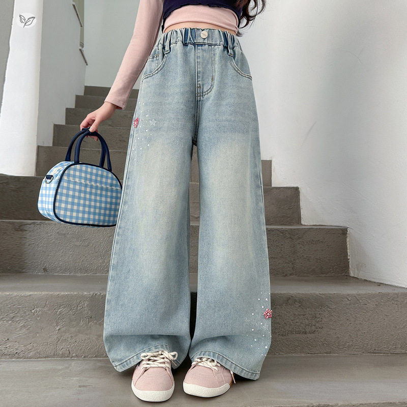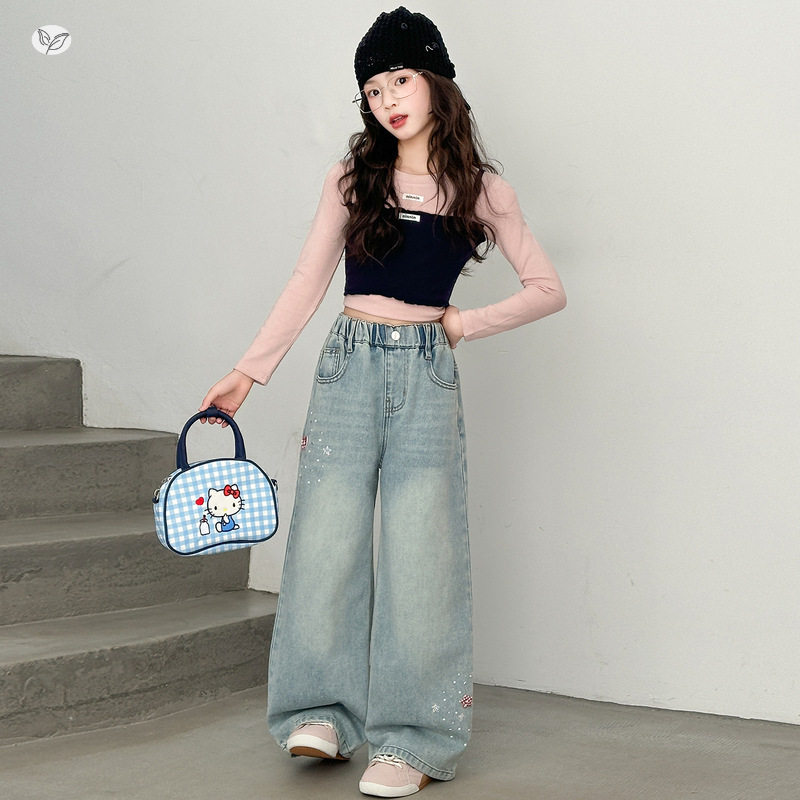 女童烫钻牛仔裤春秋2026年新款中大童韩系直筒裤阔腿裤学生拖地裤