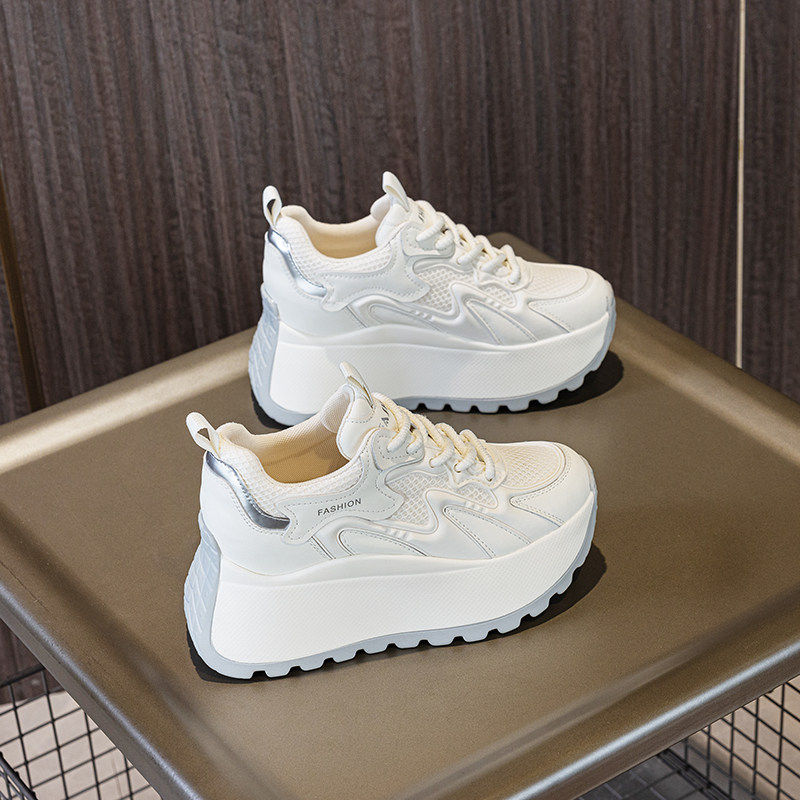2025新款网面透气内增高女鞋8CM小个子配裙子运动休闲真皮小白鞋