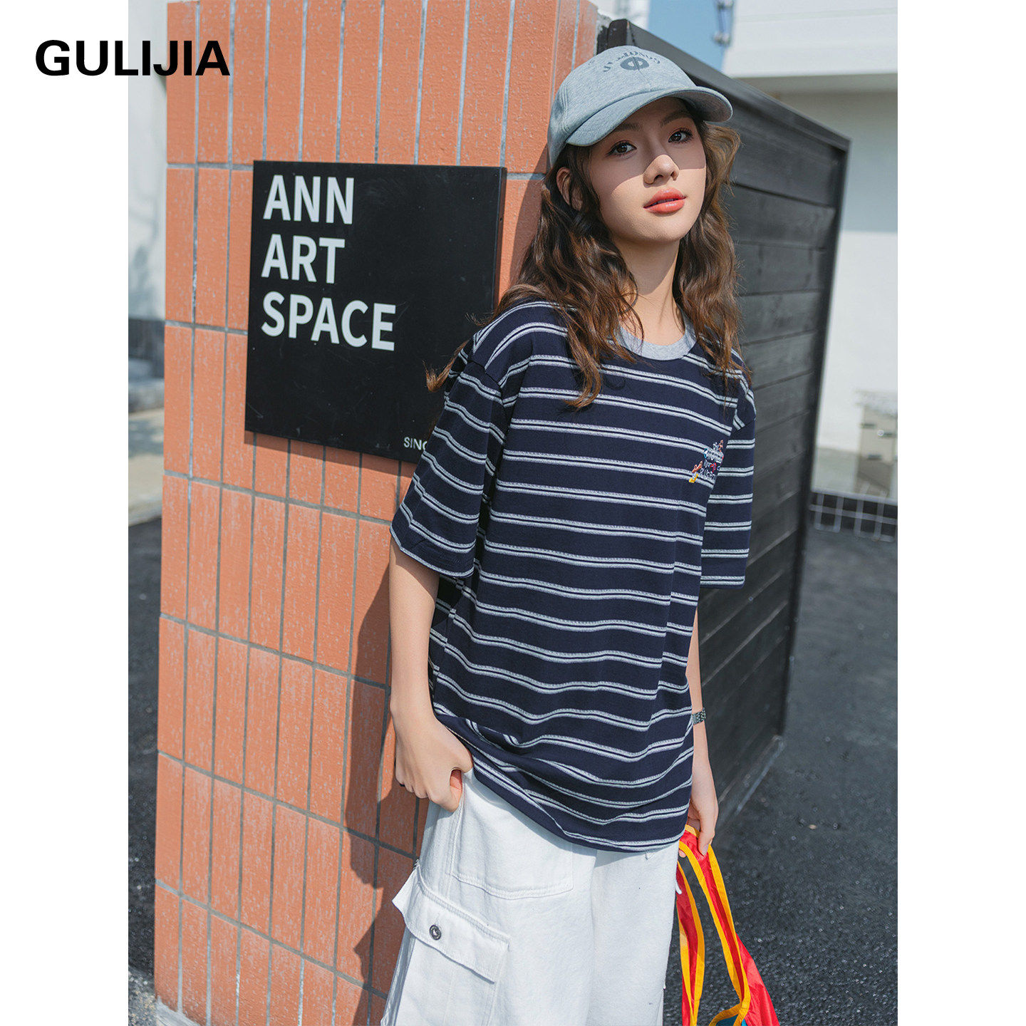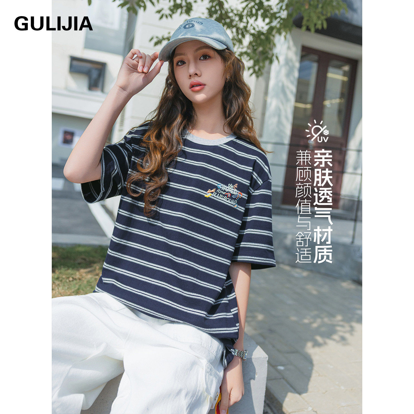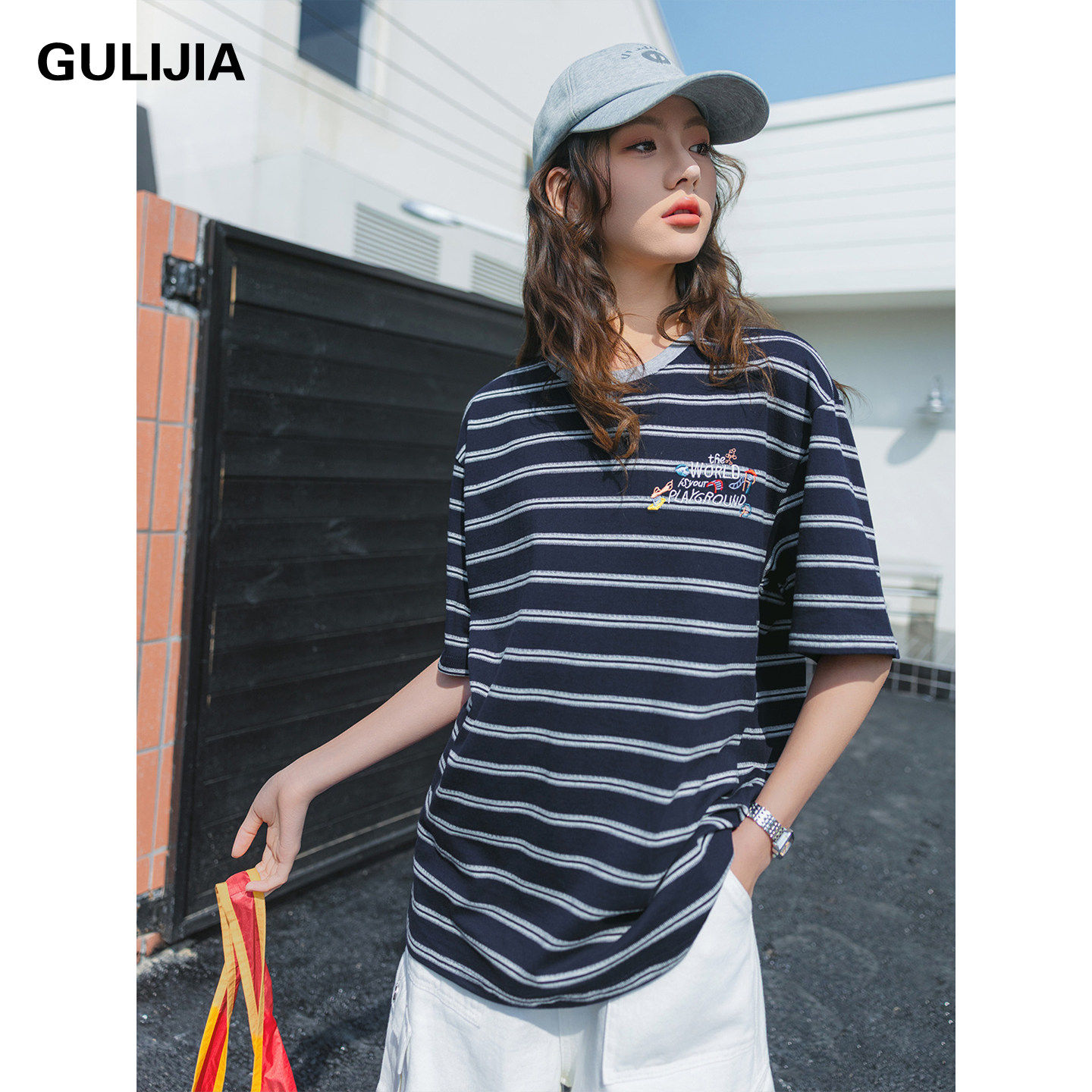 优蜜屋韩式休闲风条纹T恤女大童短袖宽松初中生刺绣上衣体恤衫15