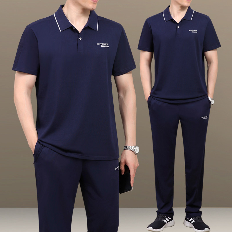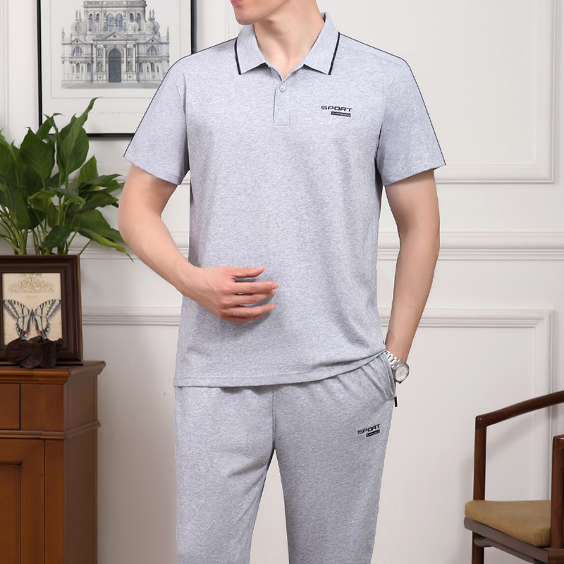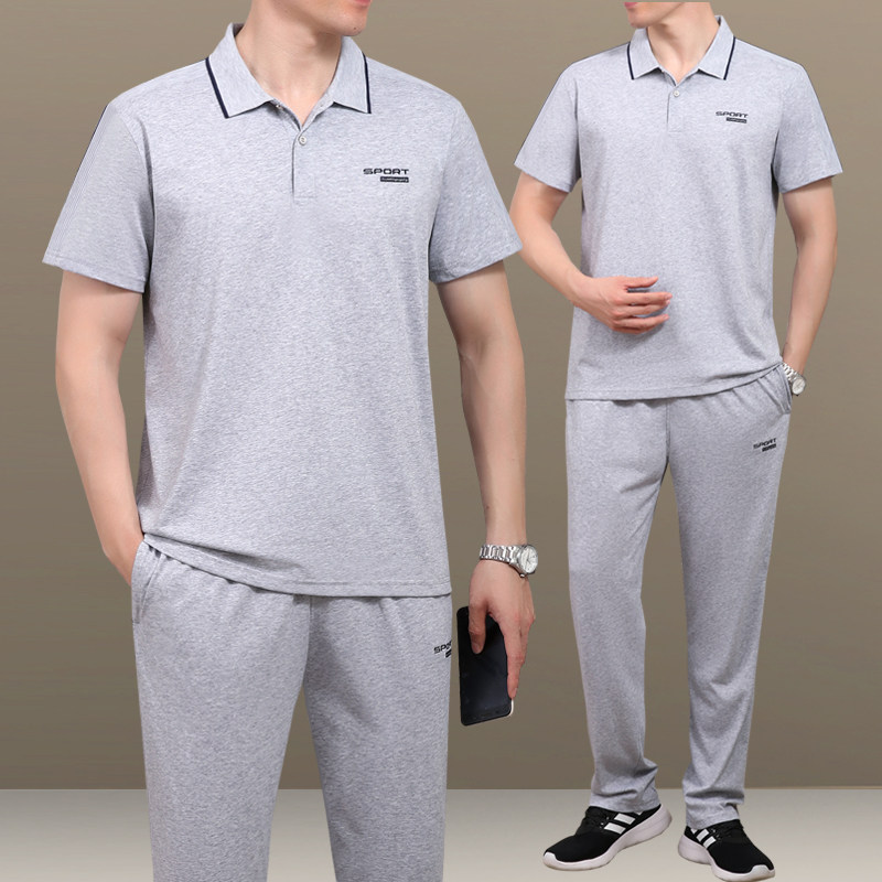 夏天季中老年男士爸爸装棉短袖长裤加大码商务休闲跑步运动服套装