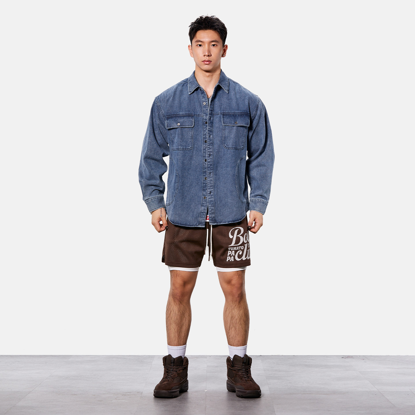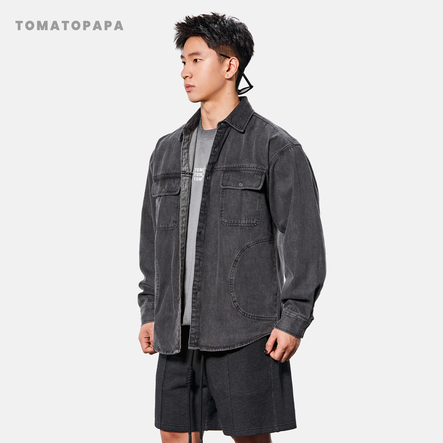 TOMATOPAPA美式复古牛仔衬衫翻领男春季宽松纽扣开衫长袖衬衣外套