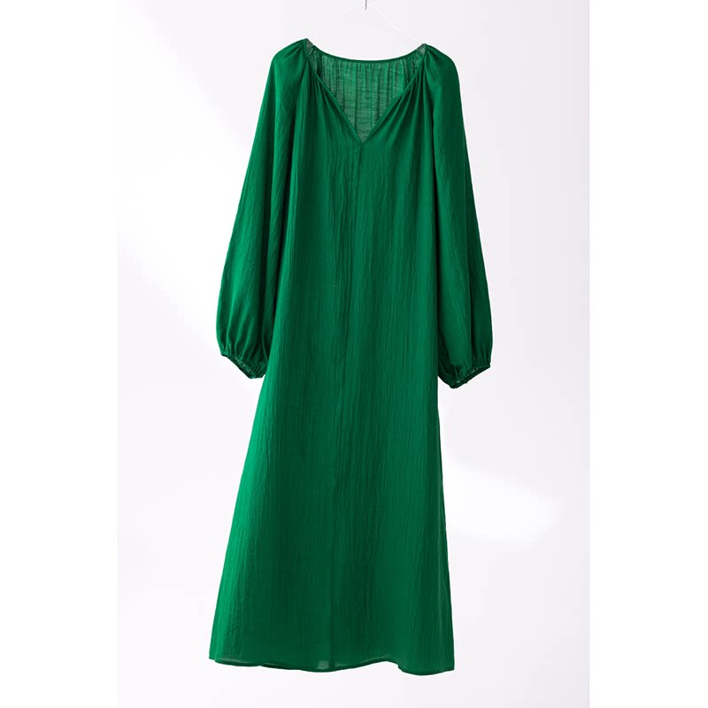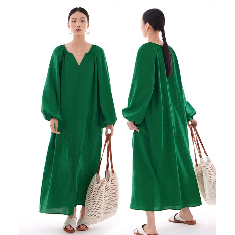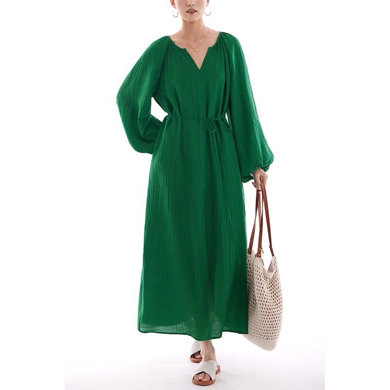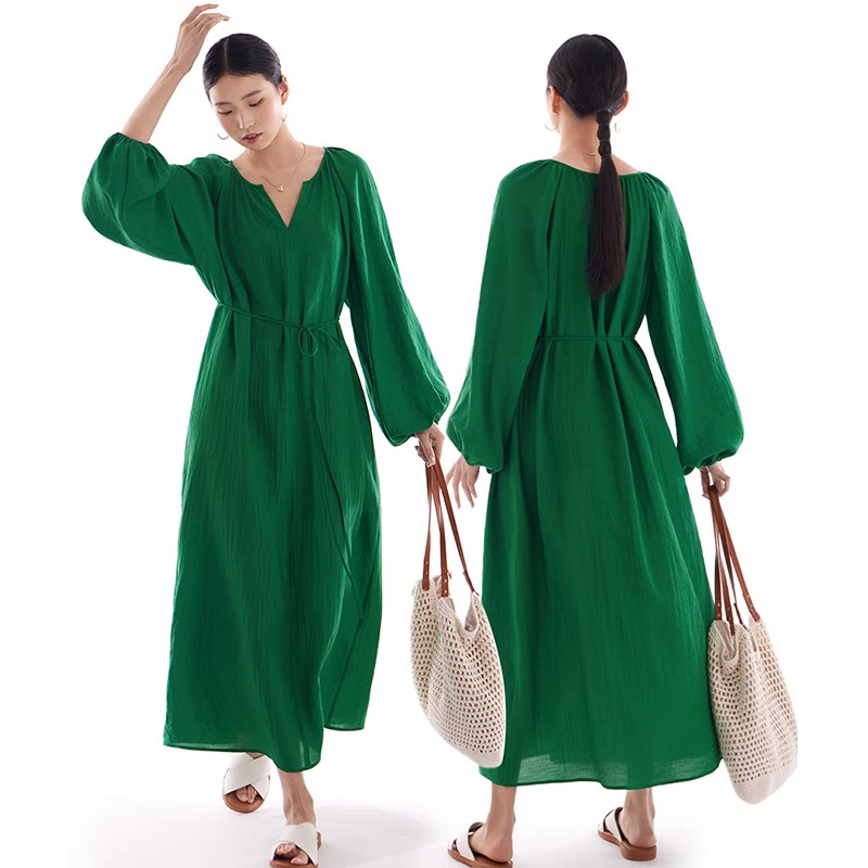连衣裙长裙2026春夏秋新款女休闲宽松茧型灯笼袖海边松弛风气质绿