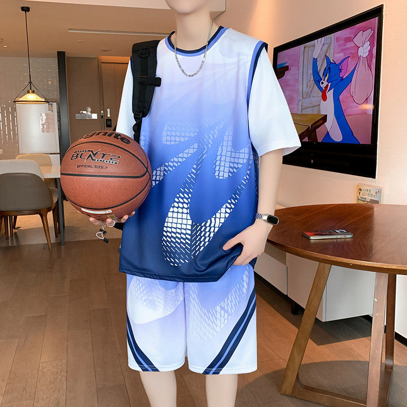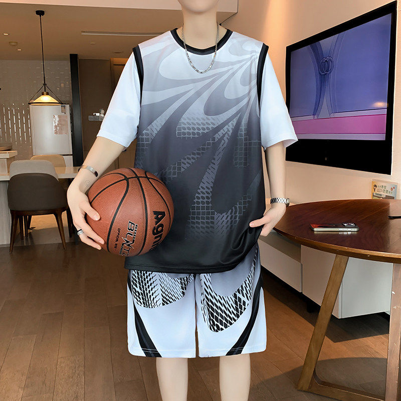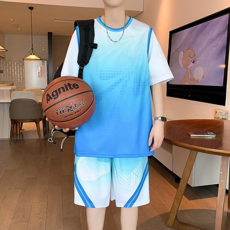 夏季冰丝篮球服套装男T恤渐变撞色假两件短袖运动速干短裤两件套
