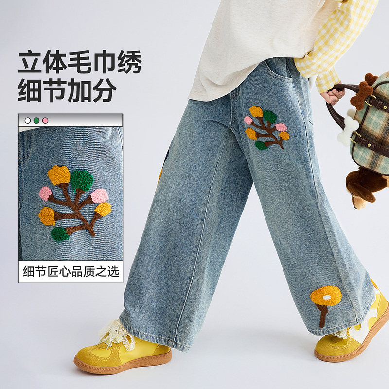 ask儿童裤子2026春夏新款女童绣花休闲牛仔裤松紧腰女孩直筒长裤