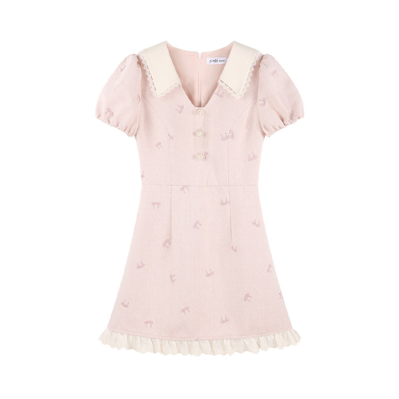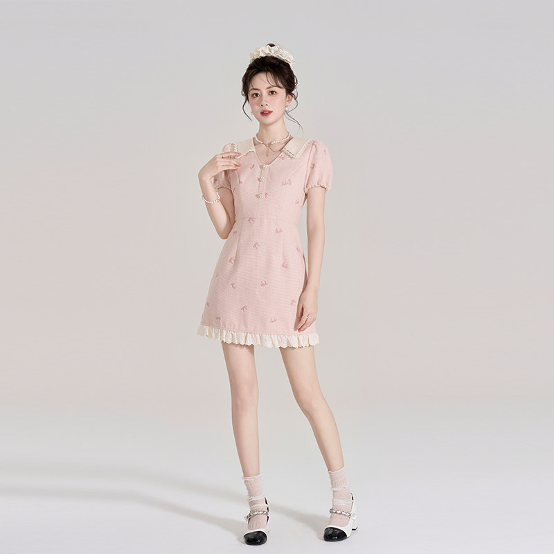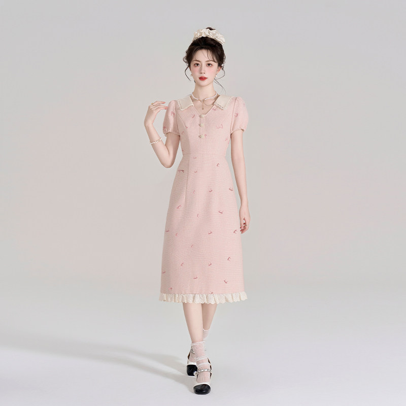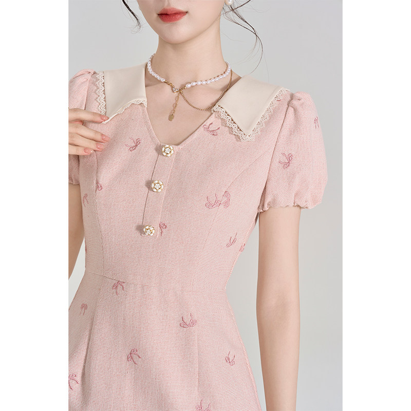311线报网描述:小香风粉色v领短袖连衣裙女夏