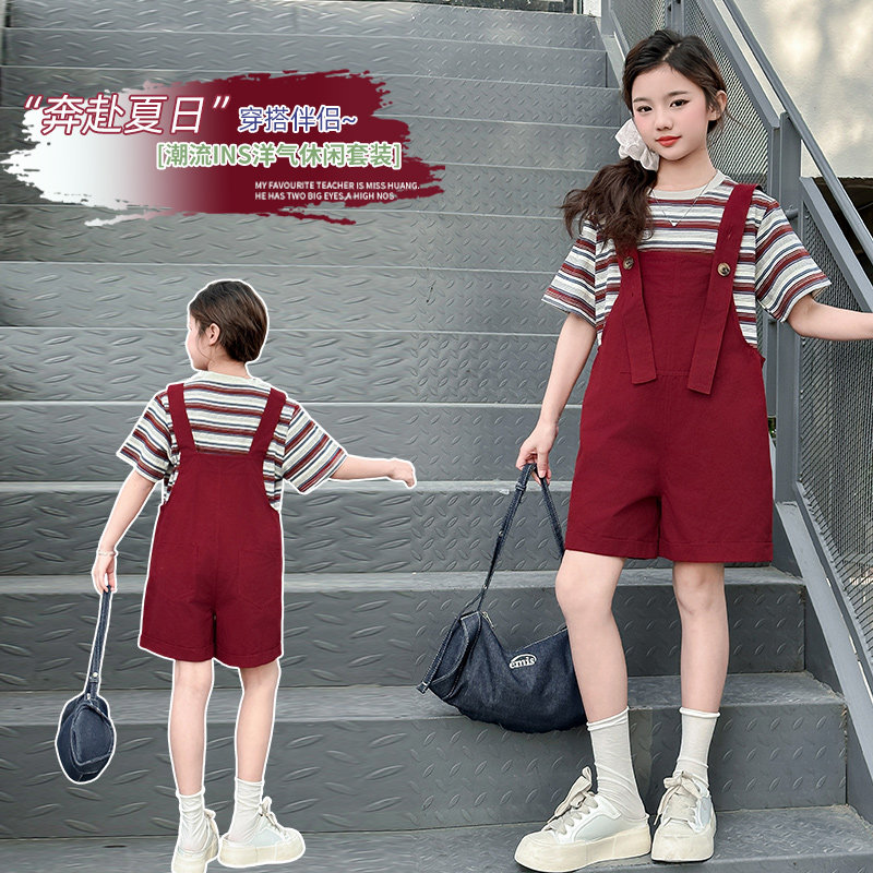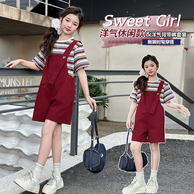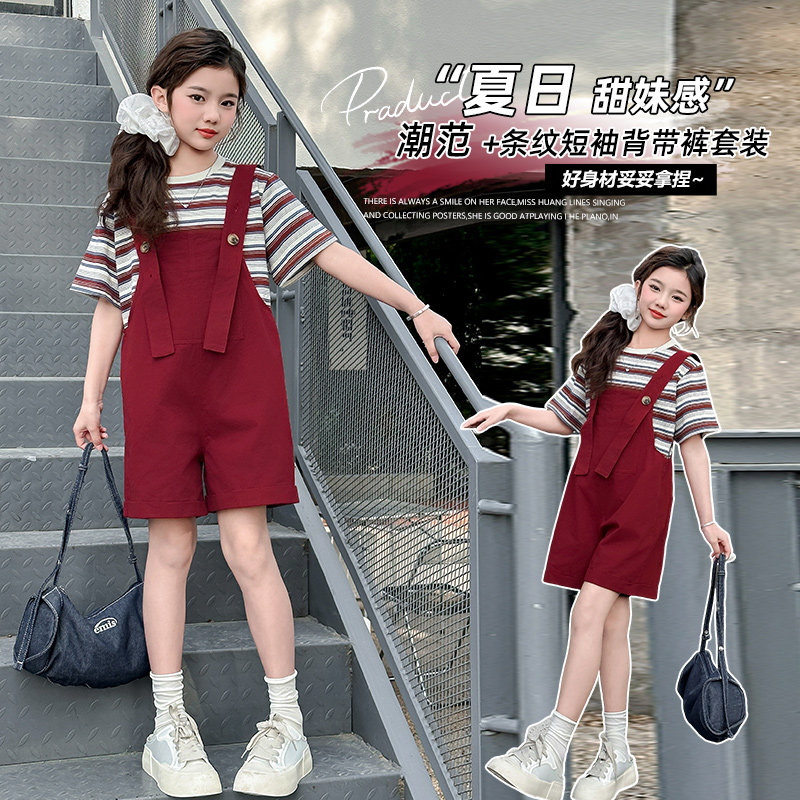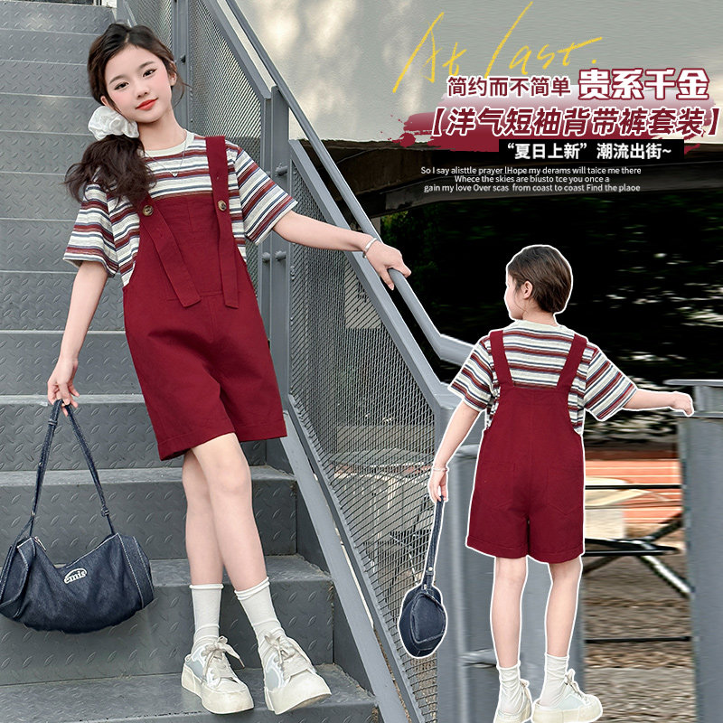 女童背带裤套装2026夏装新款时尚儿童洋气时髦条纹短袖两件套女孩