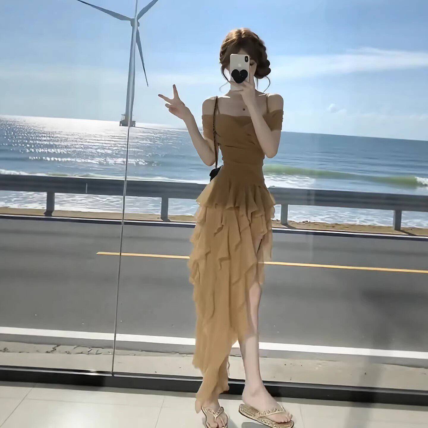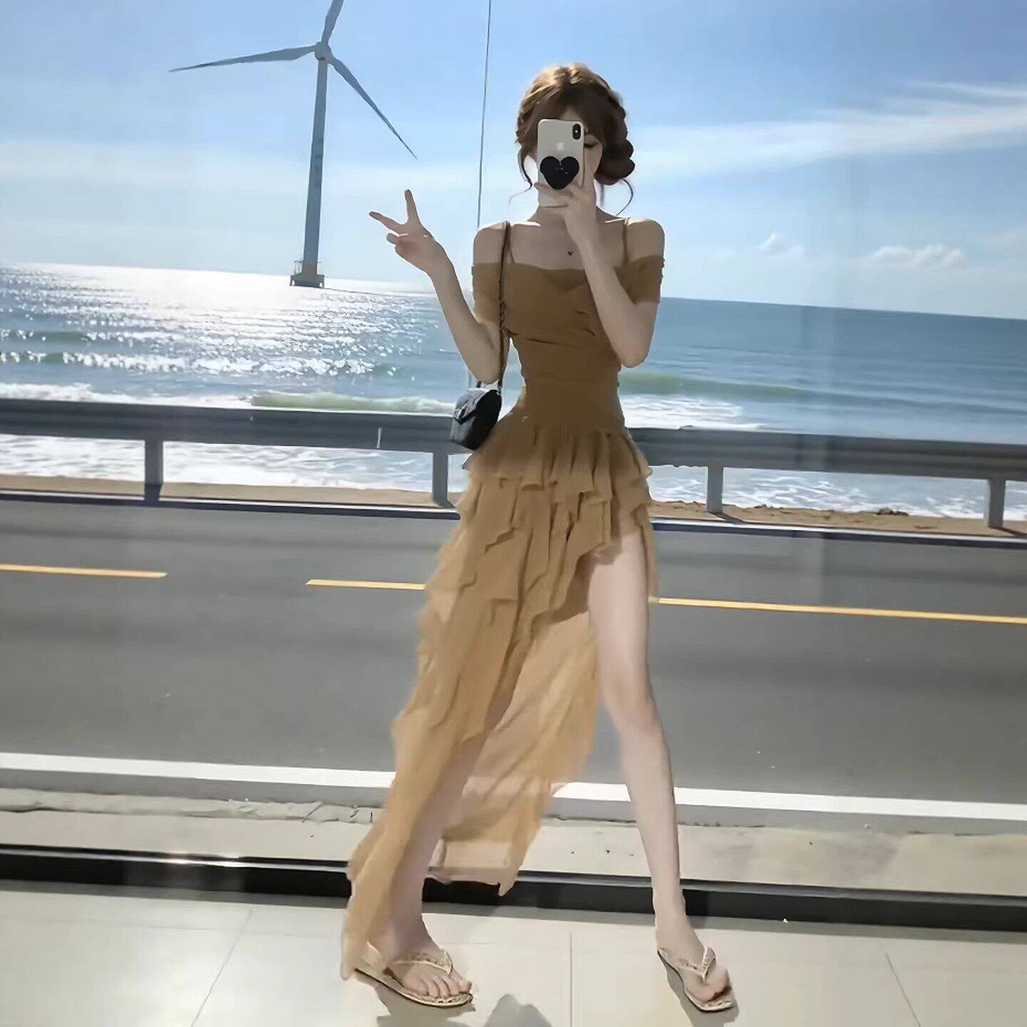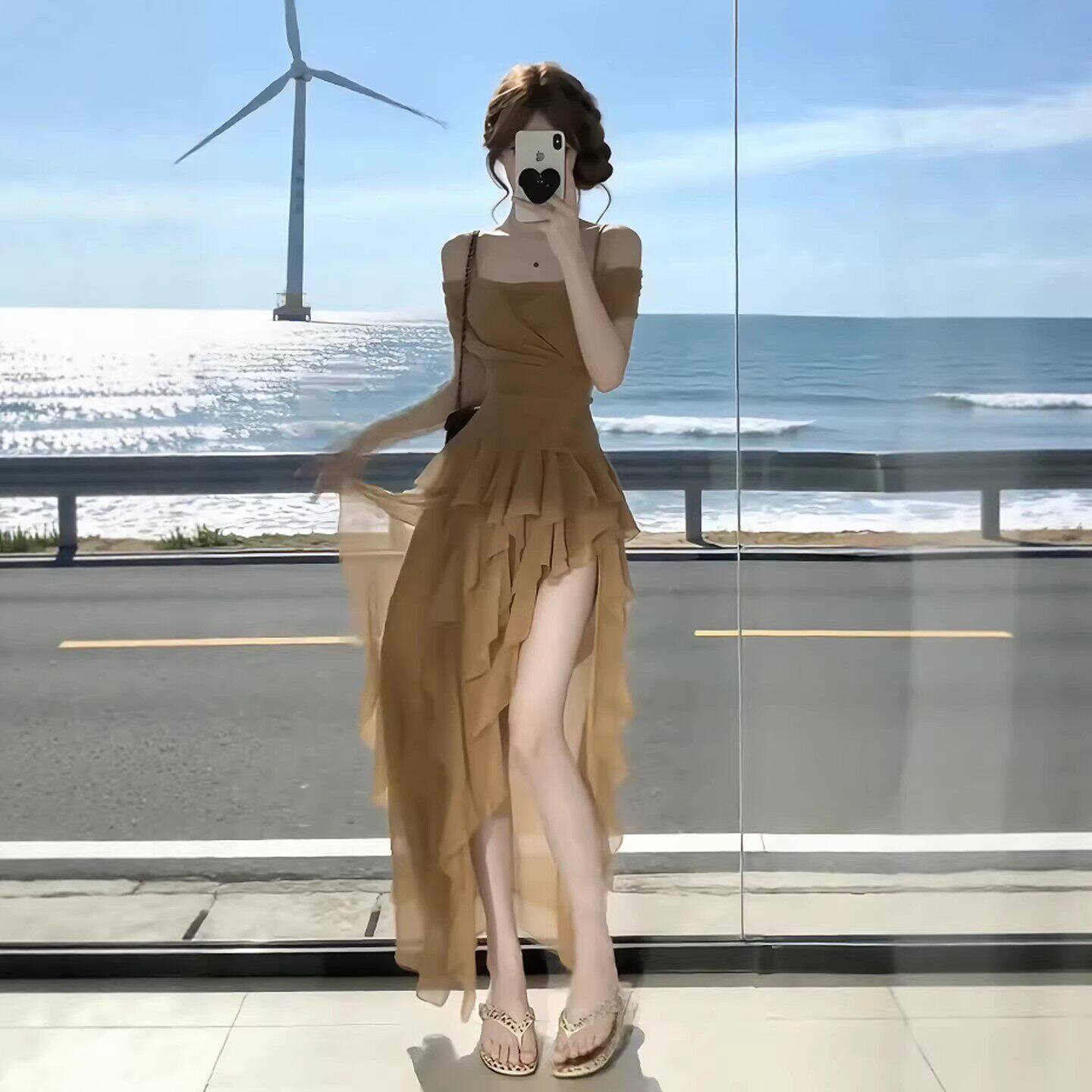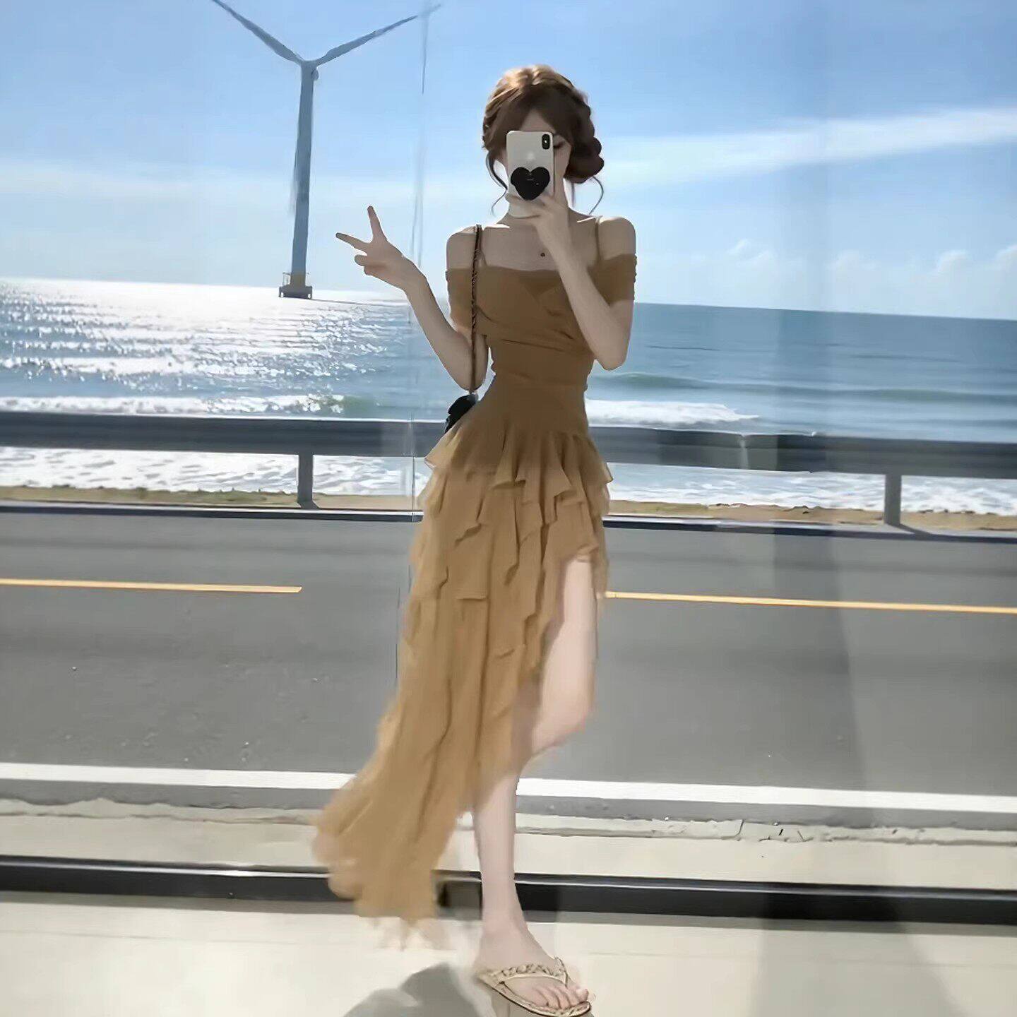 咖色吊带收腰不规则连衣裙2026年夏季新款高级感长裙法式裙子女装
