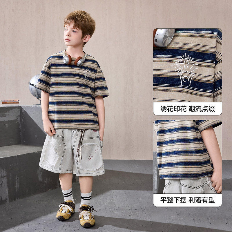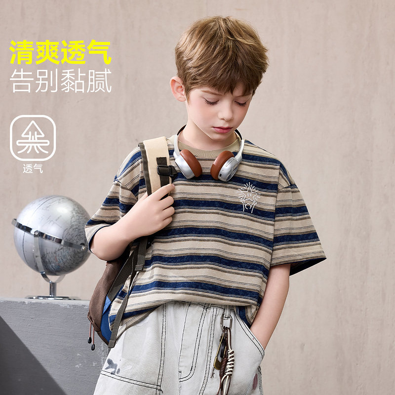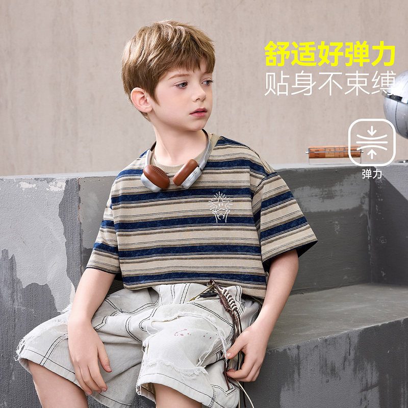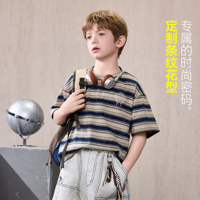 ask儿童T恤2026夏季新款男童条纹休闲短袖中大童潮流印花上衣