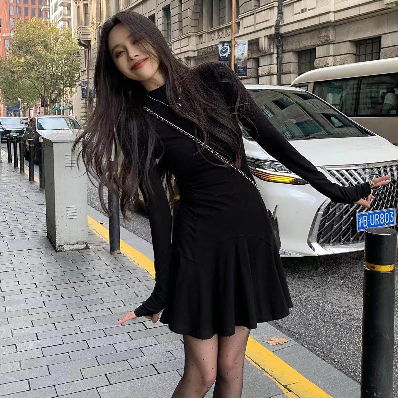 咖色休闲运动连衣裙女春秋新款半高领气质收腰长袖短款打底A字裙
