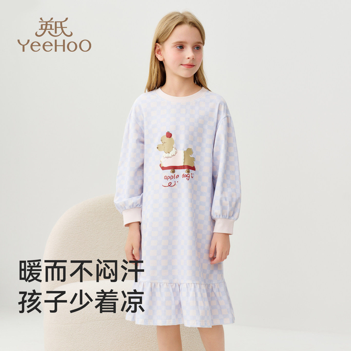 英氏女童儿童睡裙2026新款小女孩纯棉连衣裙a类格子长袖睡衣春秋