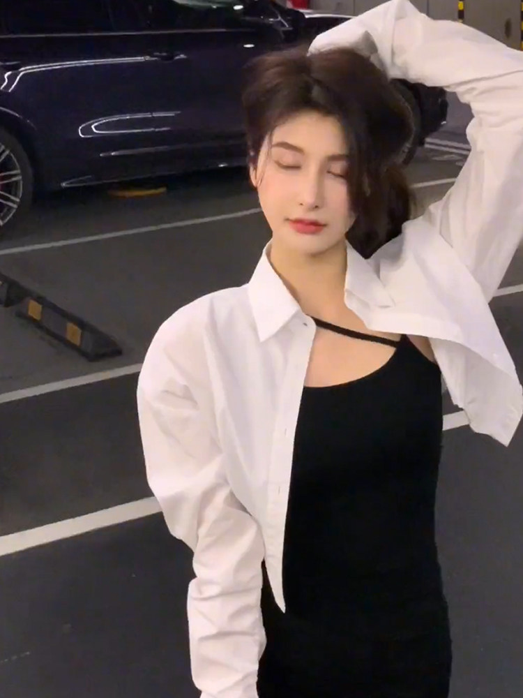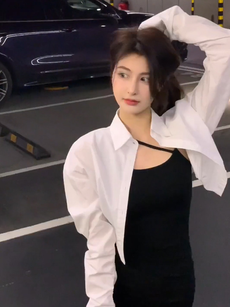 2024秋季新款白色长袖短款衬衫女显瘦吊带打底连衣裙收腰裙两件套