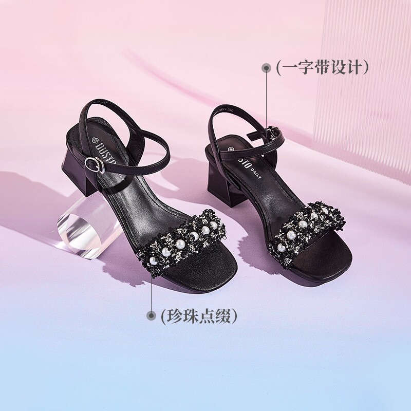 311线报网描述:水钻粗跟凉鞋女夏仙女风一字带高跟鞋配裙子