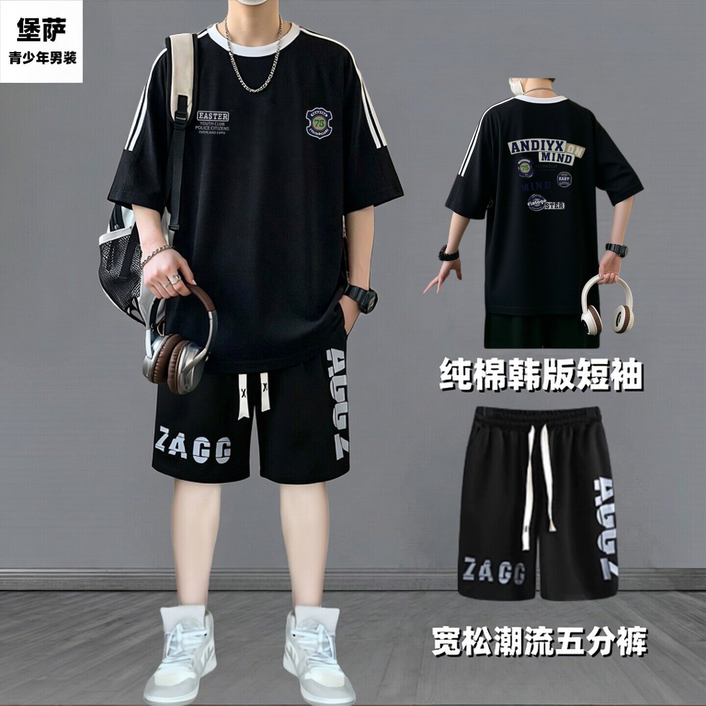 夏季纯棉短袖t恤男青少年潮字母透气印花宽松百搭套装青少年穿搭