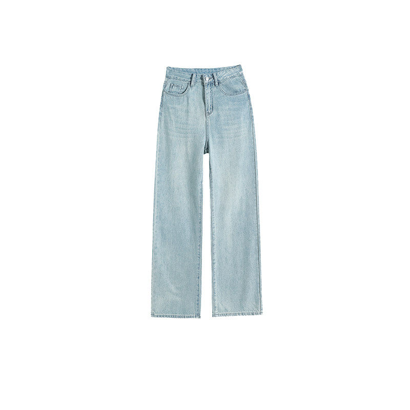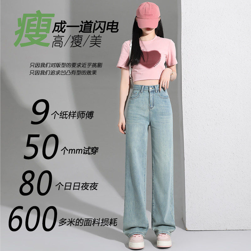 拉夏贝尔浅蓝色刺绣直筒牛仔裤女春秋2026新款高腰显瘦窄版阔腿裤