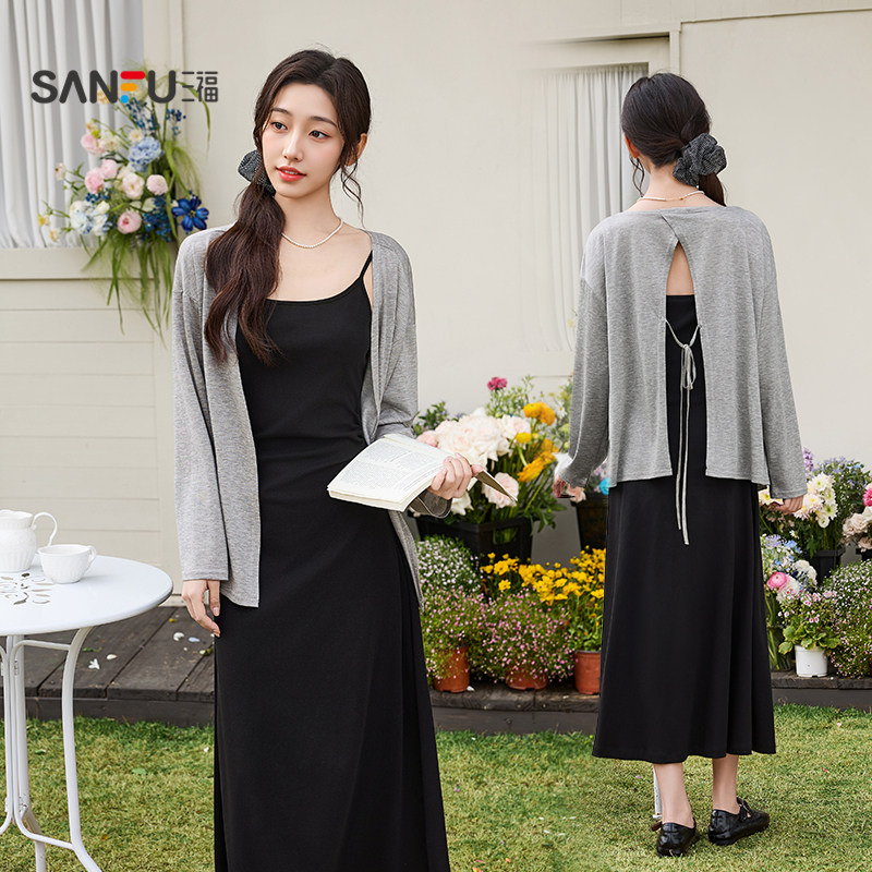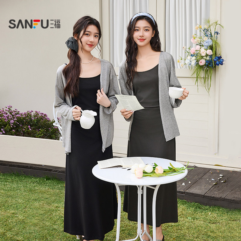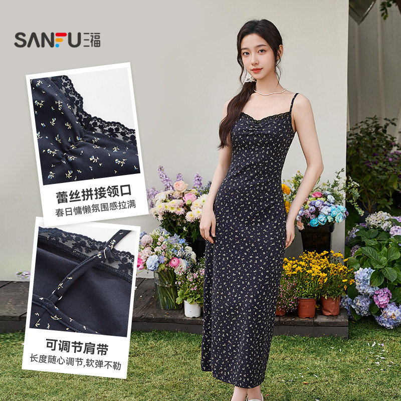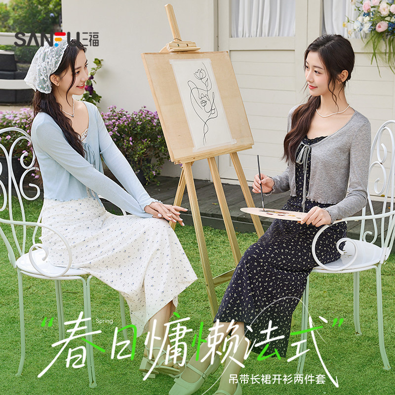 三福连衣裙套装2026新款春季气质碎花绑带吊带长裙披肩两件套女装