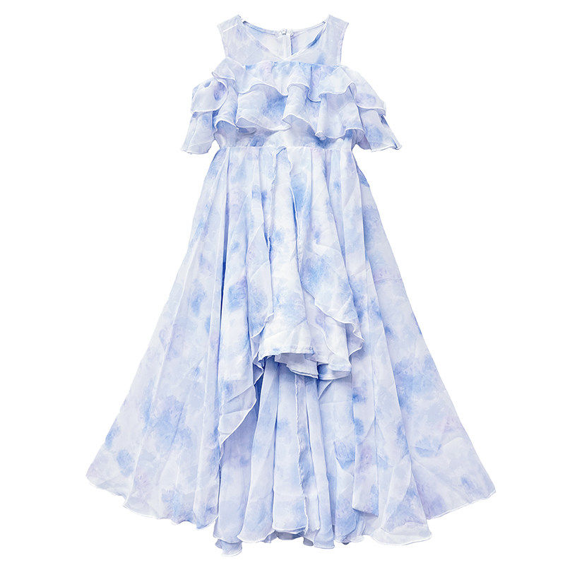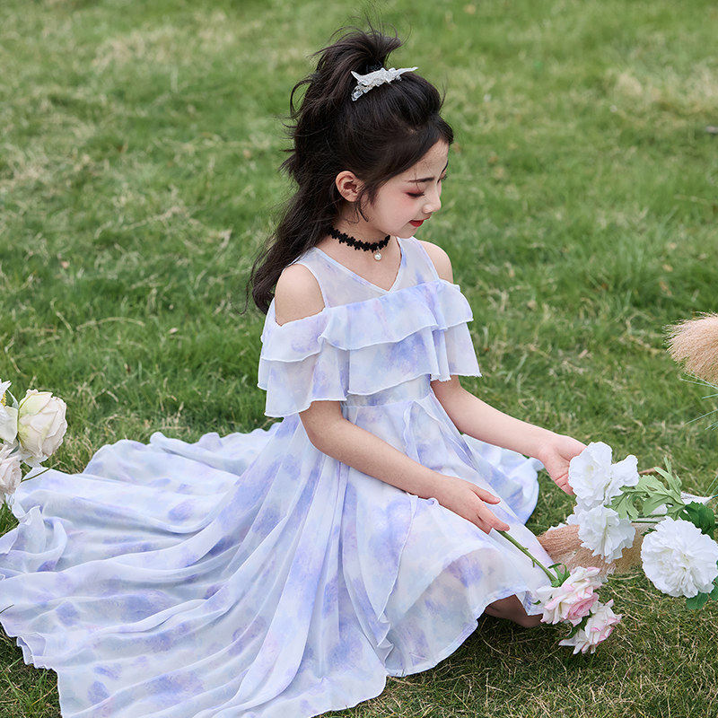 女童洋装2025新款夏季雪纺碎花洋派薄款女孩拖尾公主风裙子夏装