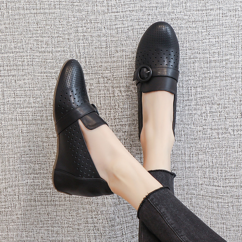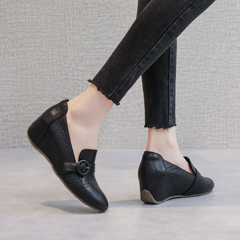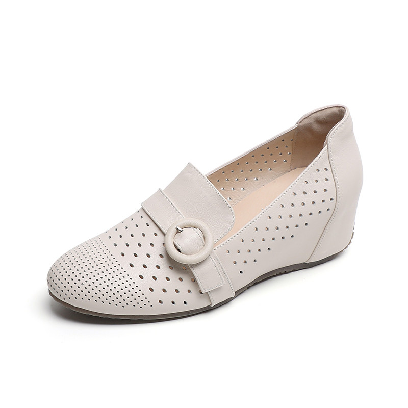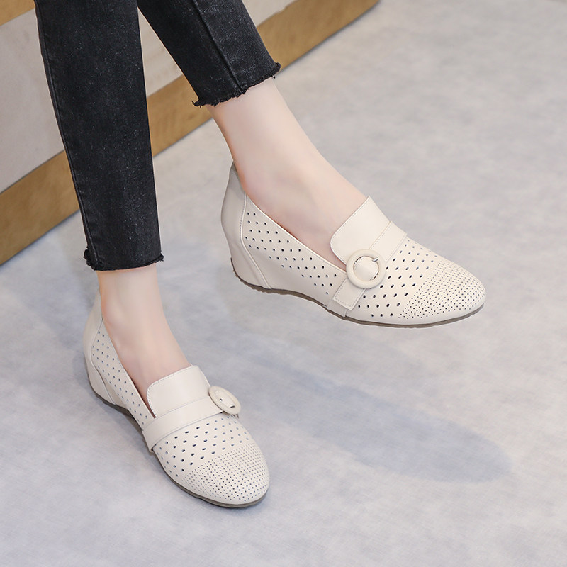 夏季新款镂空软底透气休闲鞋内增高女鞋春款真皮不累脚坡跟单鞋女
