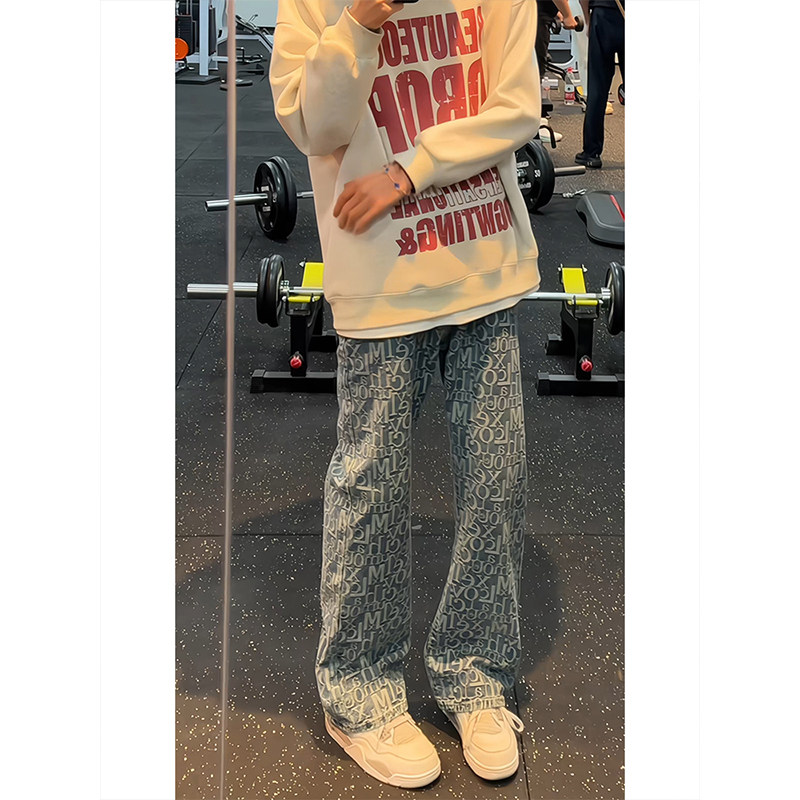 浅蓝色字母提花满印牛仔裤男款夏季美式潮牌vibe修身弯刀微喇裤子