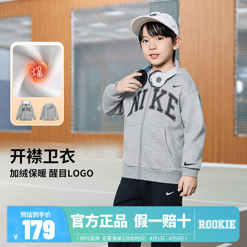 Nike 3brand儿童卫衣开衫男童加绒上衣2025冬季童装运动女童外套