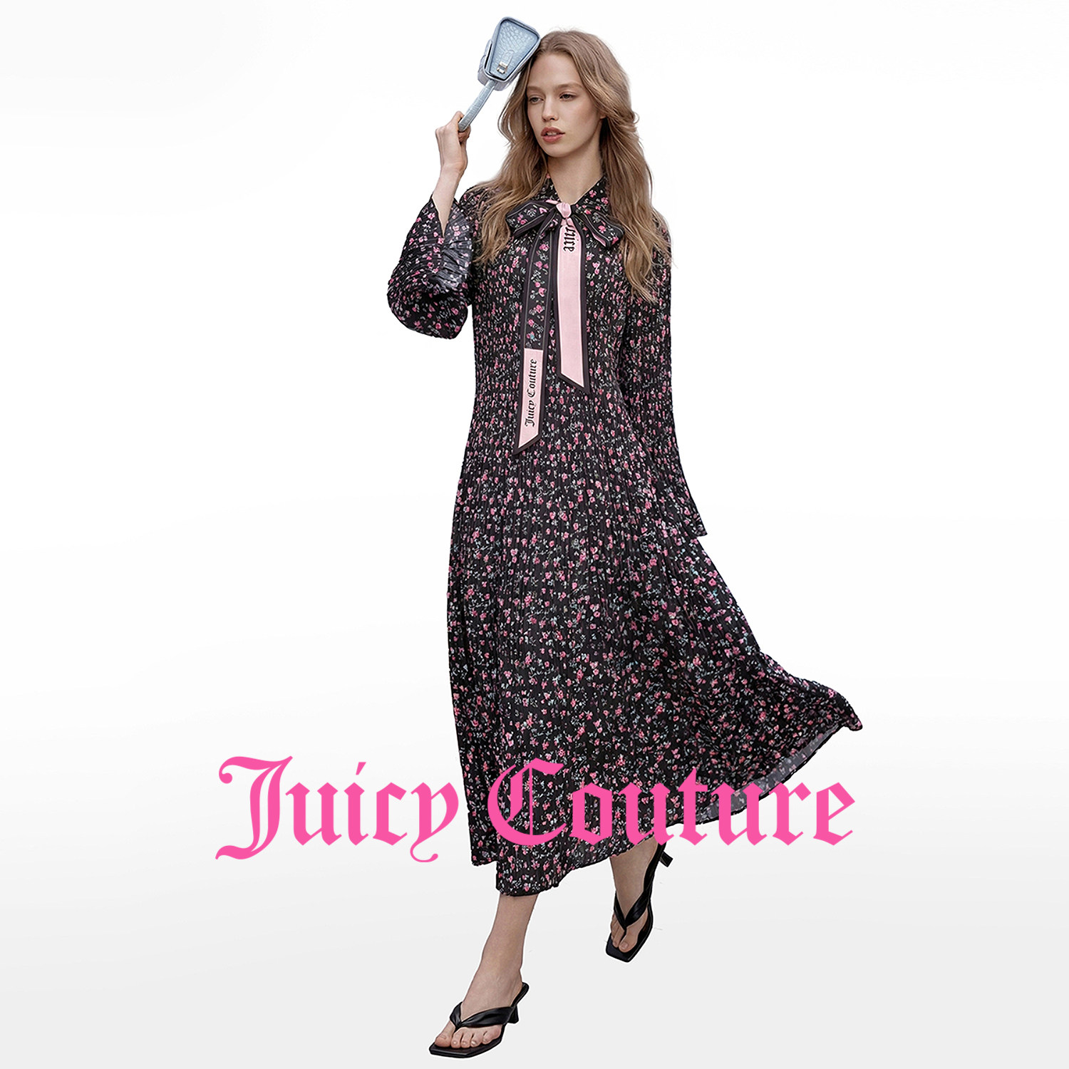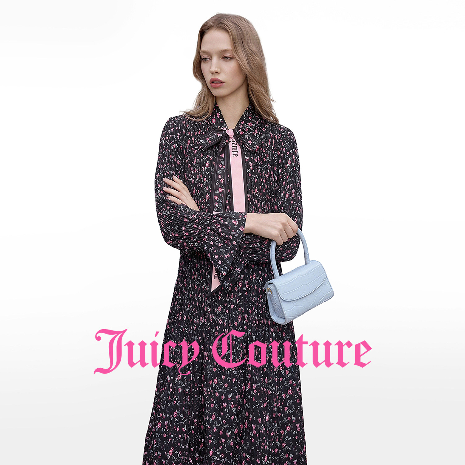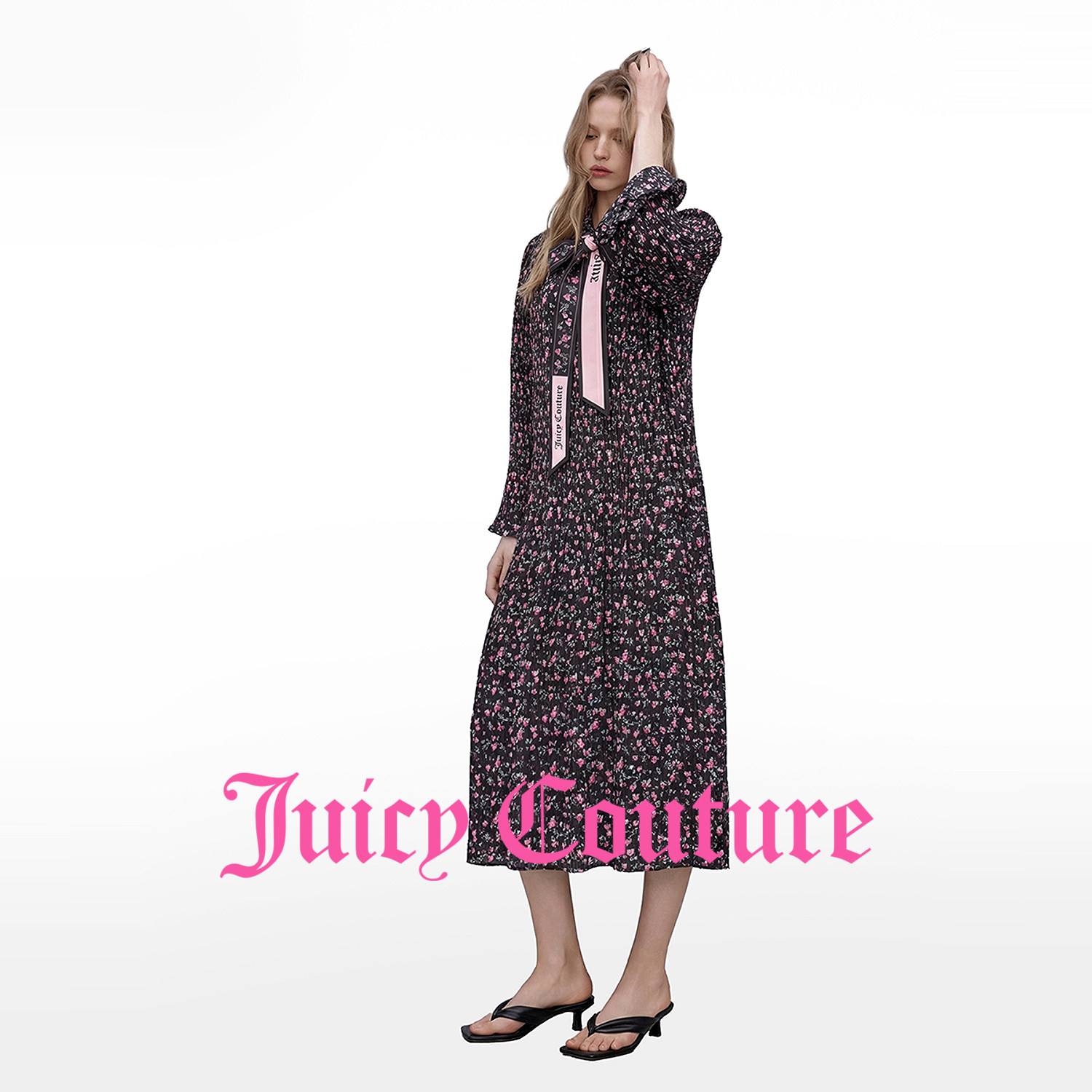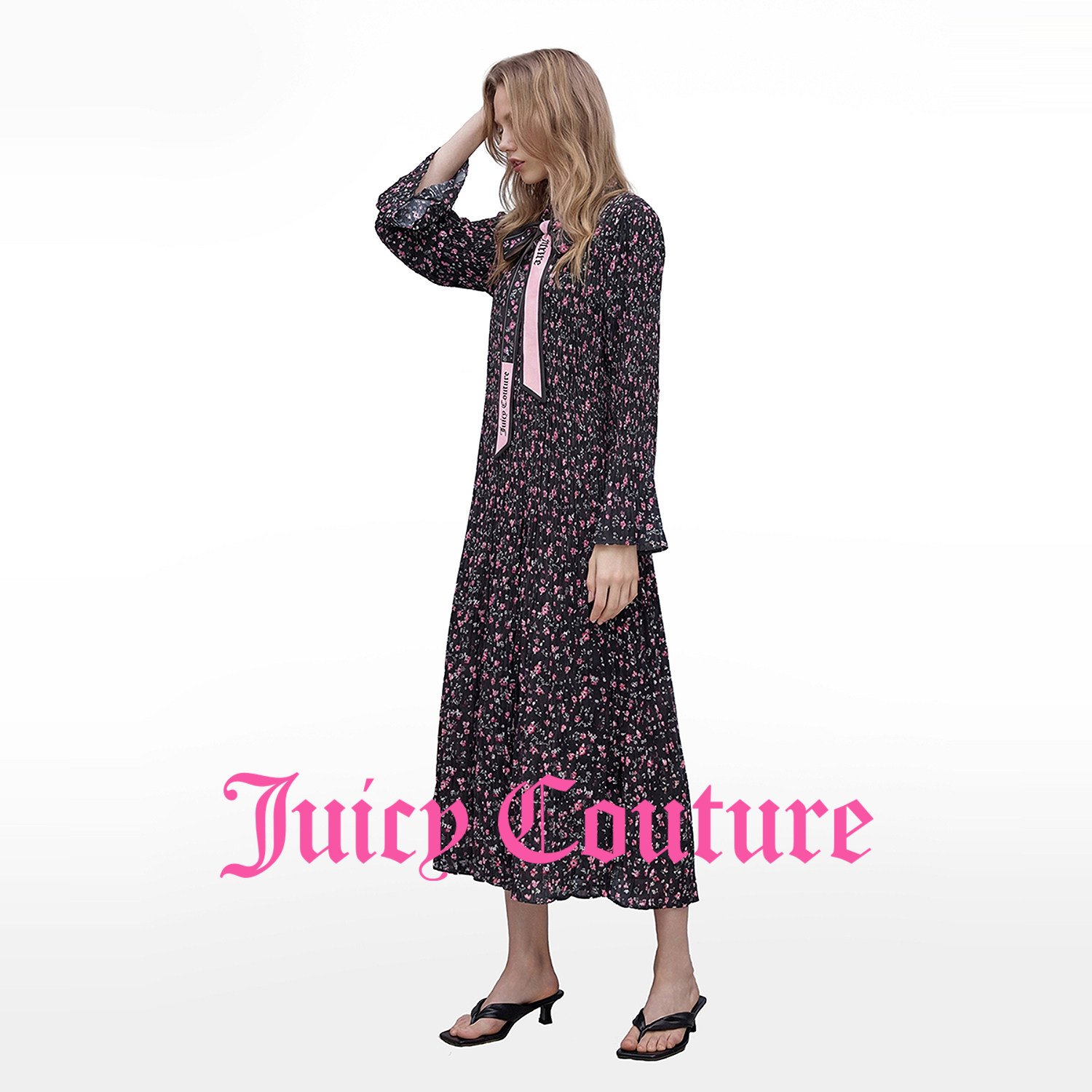 Juicy Couture橘滋连衣裙女26夏季新款法式碎花长袖黑色系带长裙