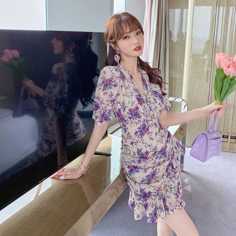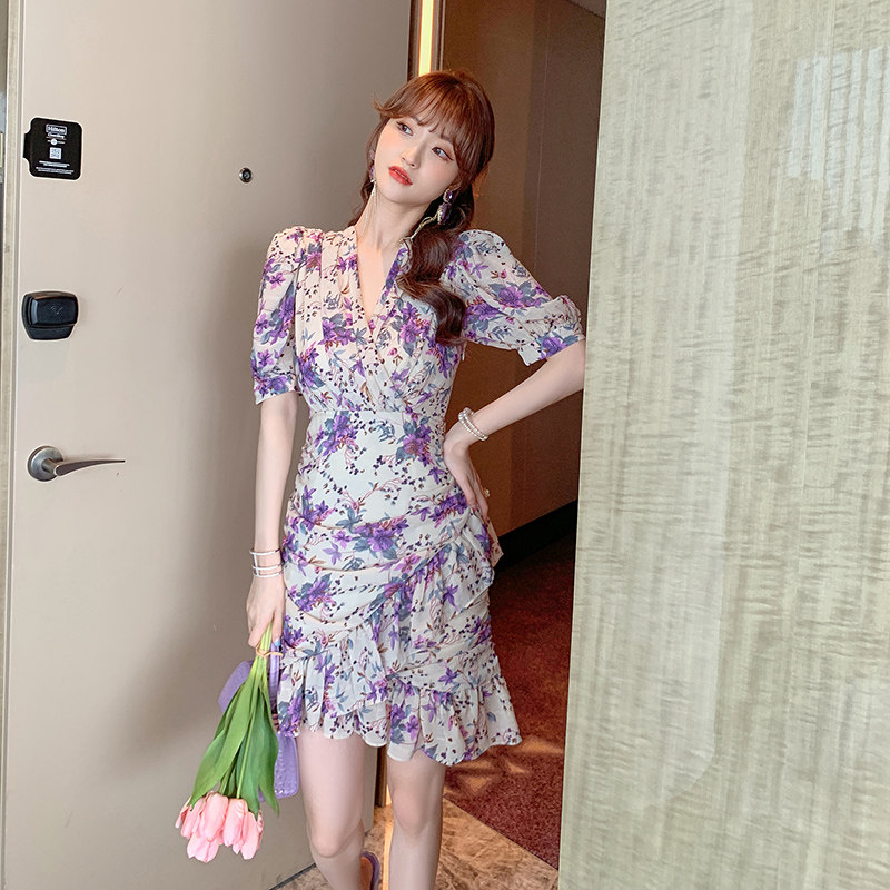 雪纺碎花连衣裙短款2026女夏泡泡袖收腰显瘦气质褶皱荷叶边鱼尾裙