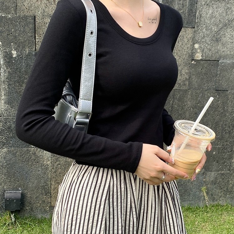 绿色圆领t恤女长袖内搭春夏季2026新款低领打底衫正肩修身小上衣