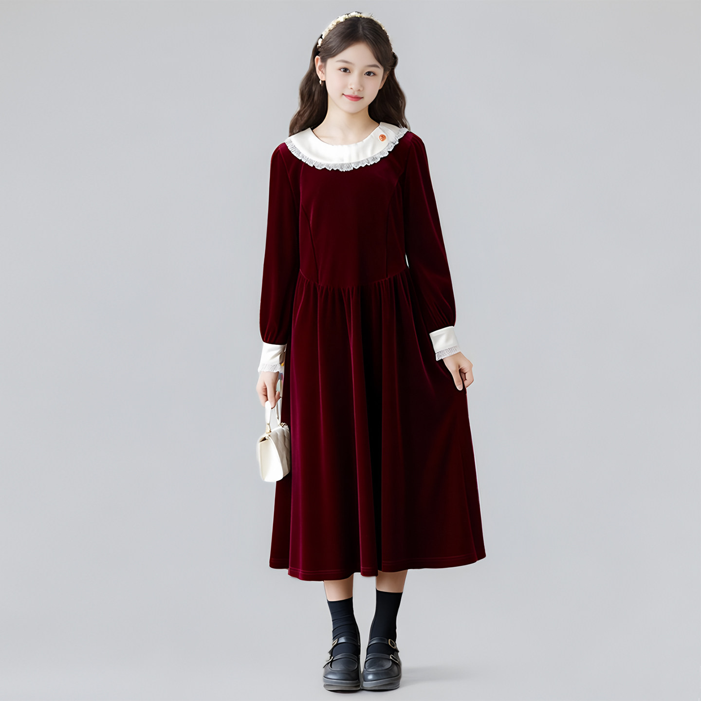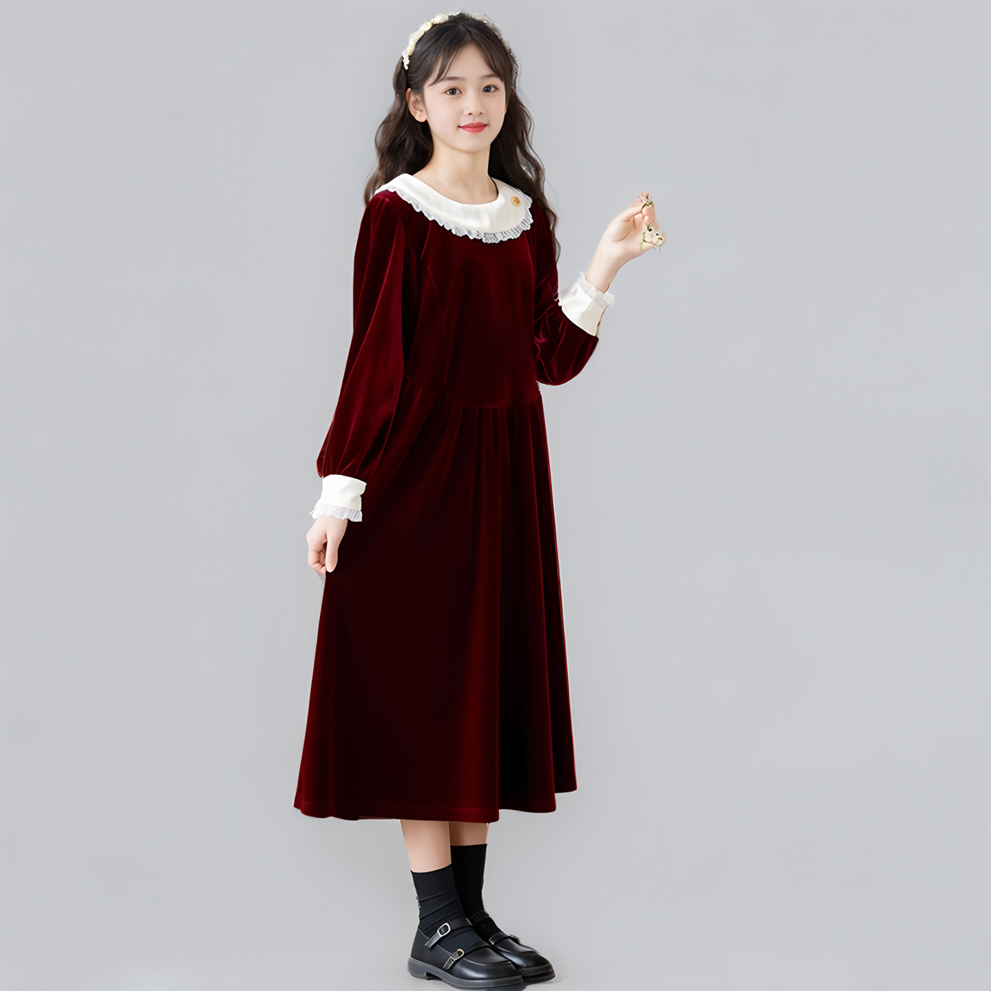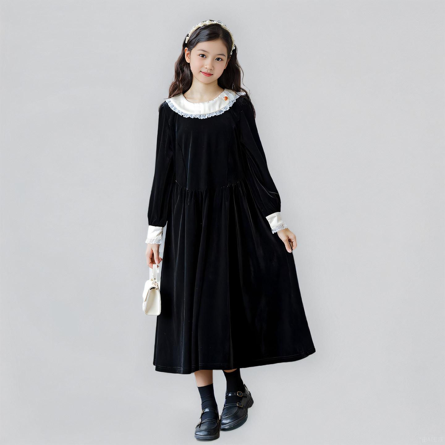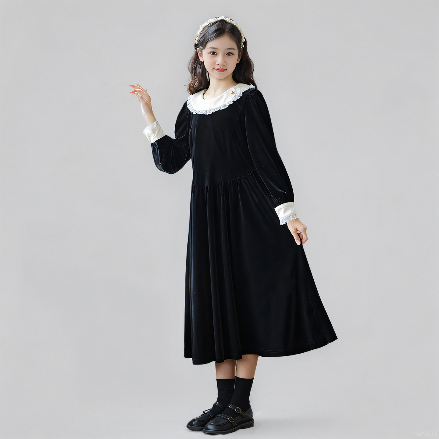 女童丝绒连衣裙秋冬新款韩版礼服公主裙中大童法式赫本风黑色长裙