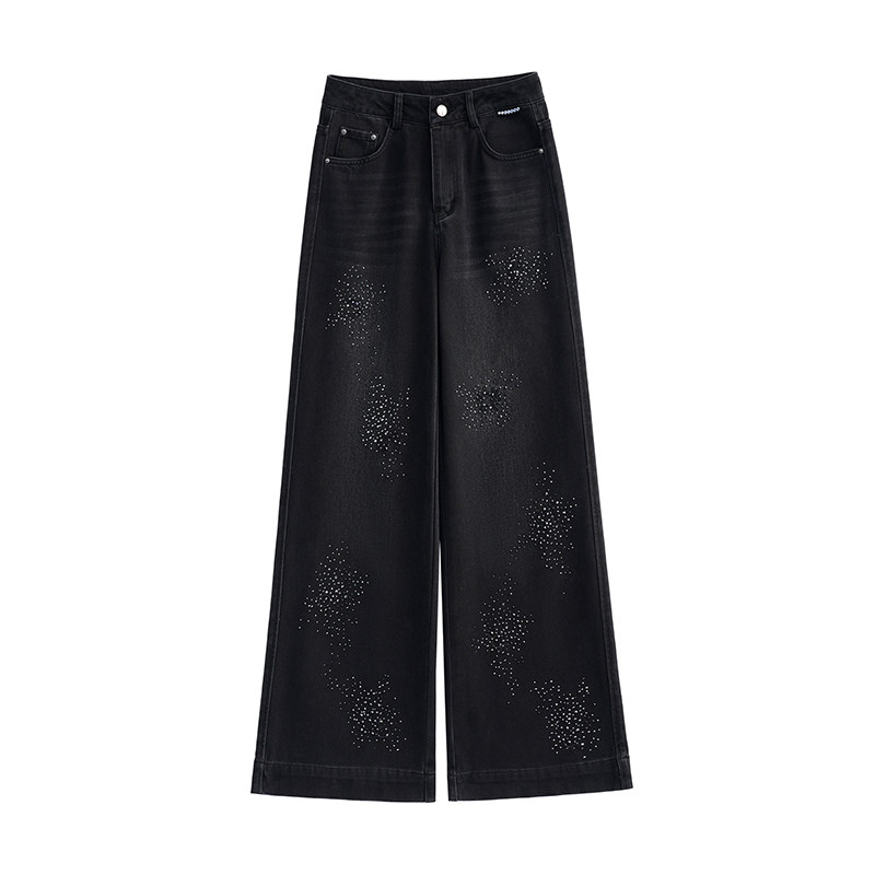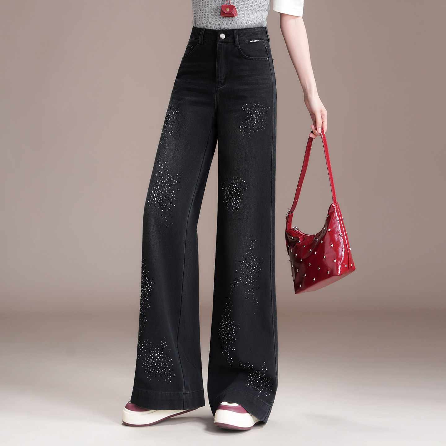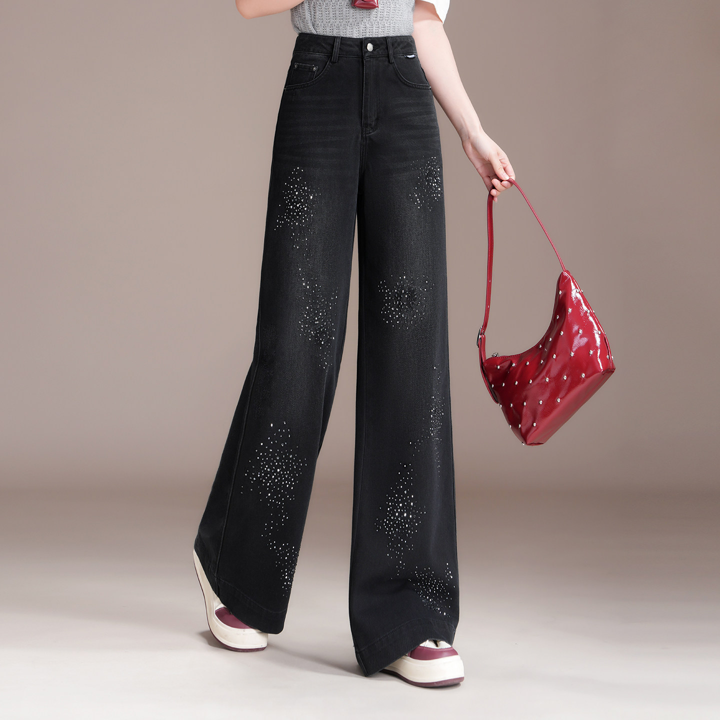 黑色烫钻高腰阔腿牛仔裤女春季2026新款宽松显瘦垂感拖地直筒长裤