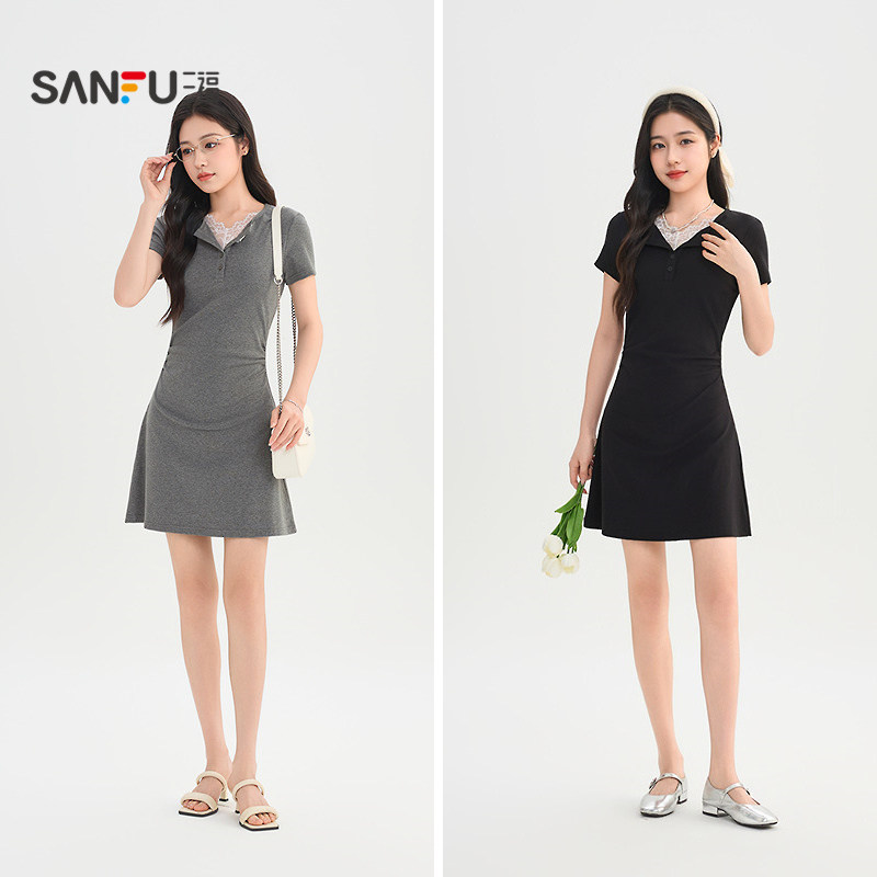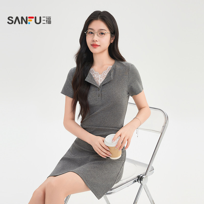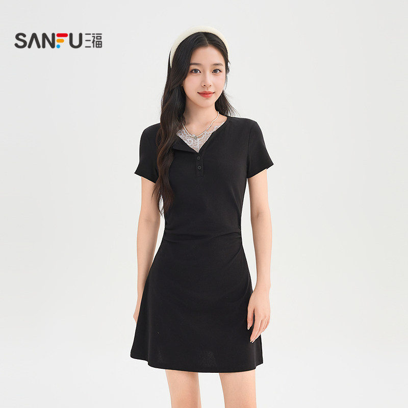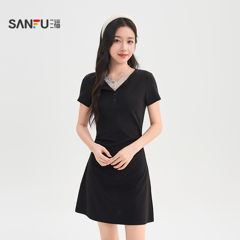 三福纯欲连衣裙2026新款夏季气质小V领蕾丝边收腰显瘦短裙子女装