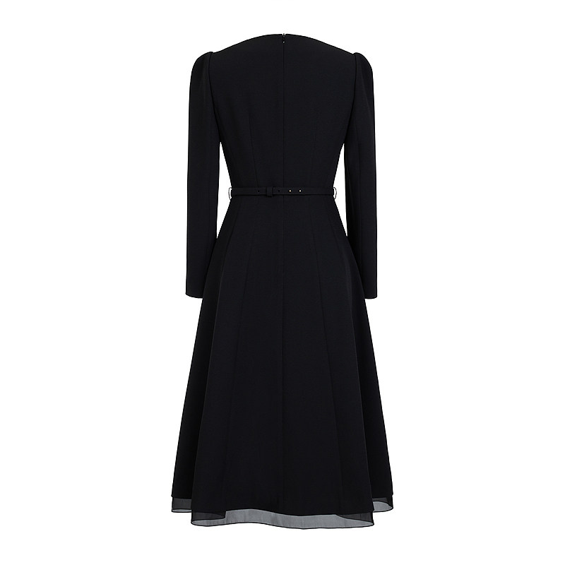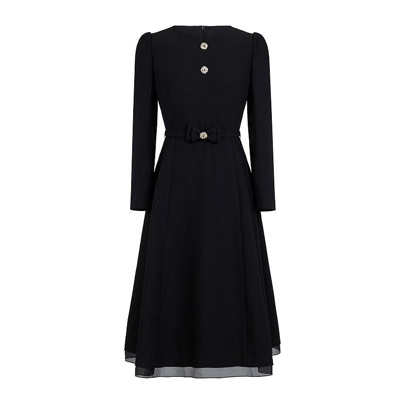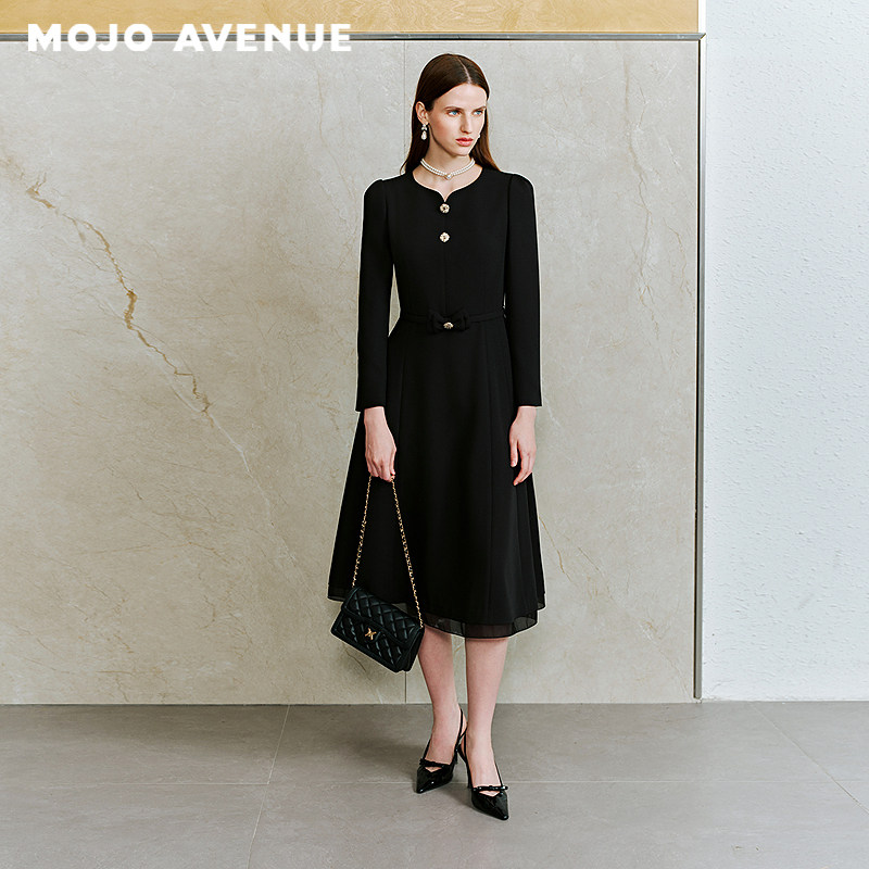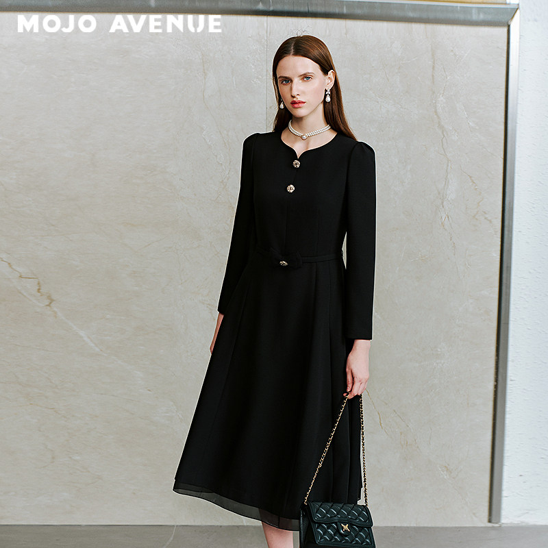朗姿/MOJO莫佐2026春新品高贵优雅长袖连衣裙黑色小V领收腰A摆
