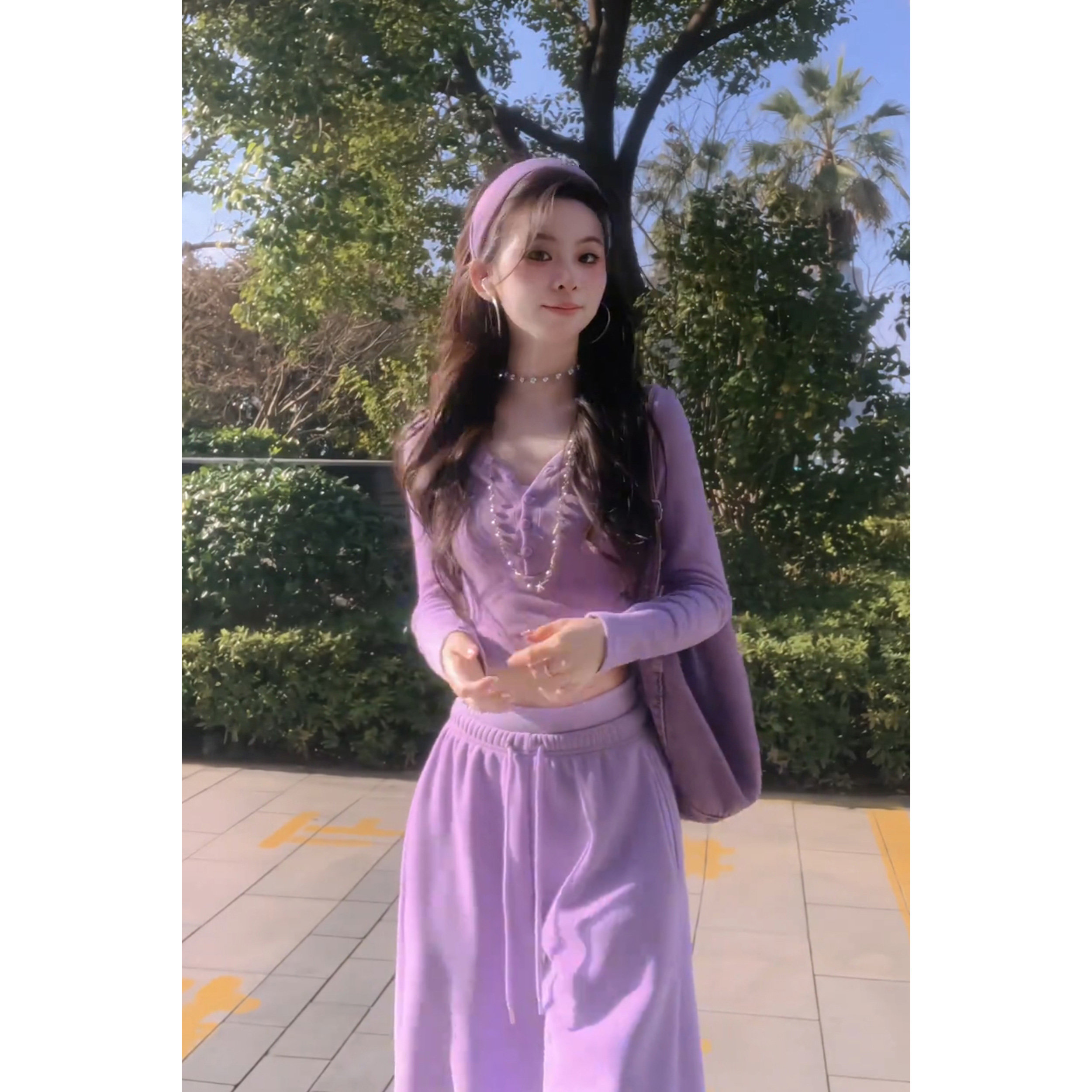 紫色超火减龄上衣女春季2026新款正肩V领长袖t恤紧身显瘦打底衫女