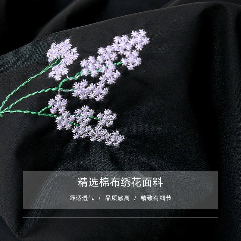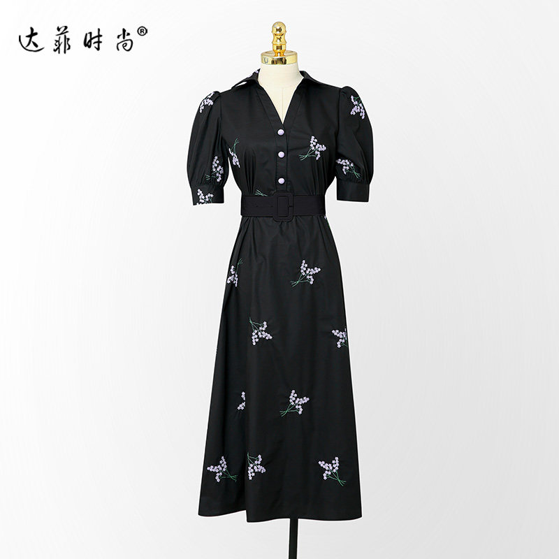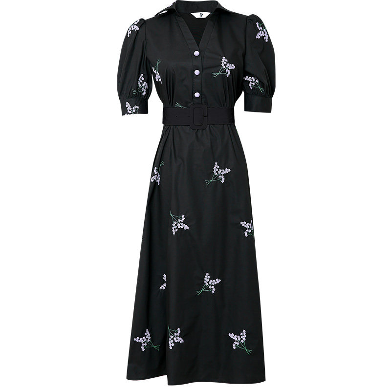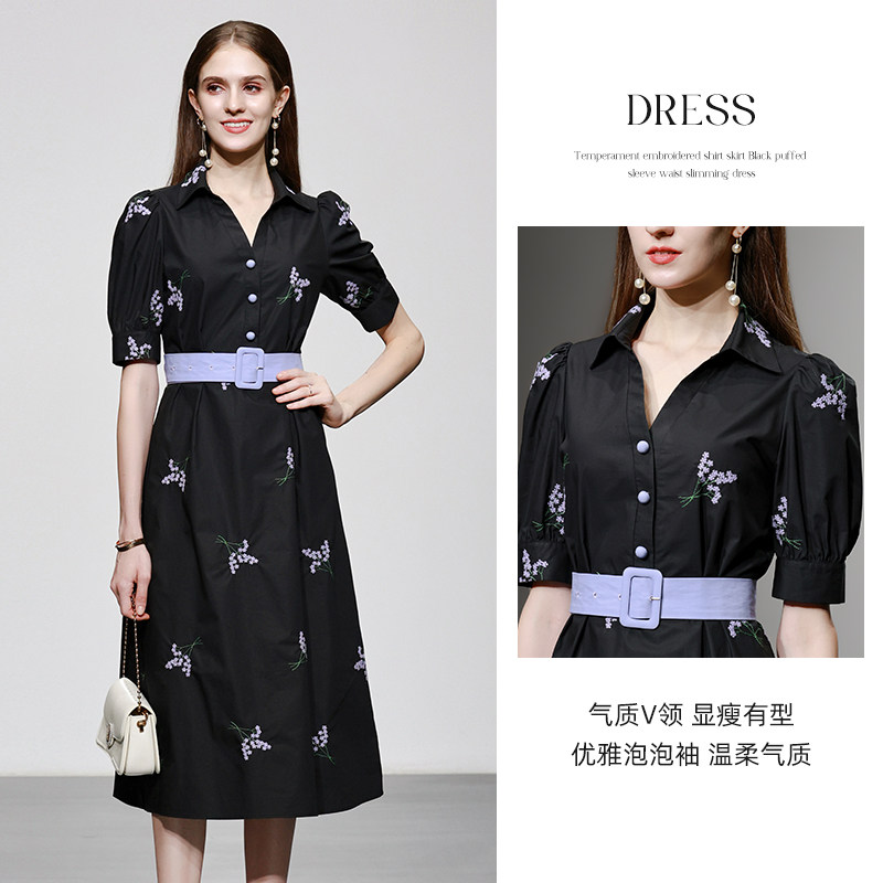 2026夏装新款女装绣花衬衫裙子黑色泡泡袖收腰显瘦连衣裙长裙