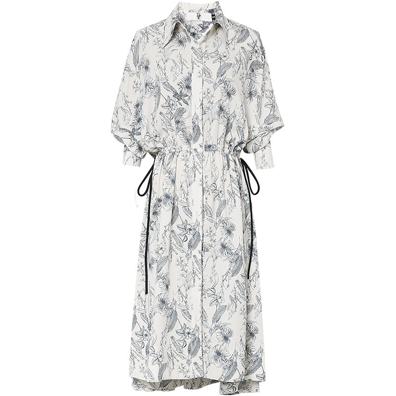 夏季女装2026新款气质杏色蝙蝠袖收腰显瘦印花衬衫连衣裙长裙