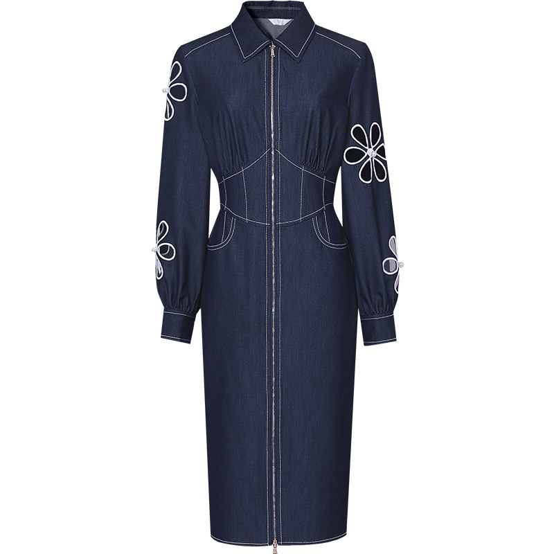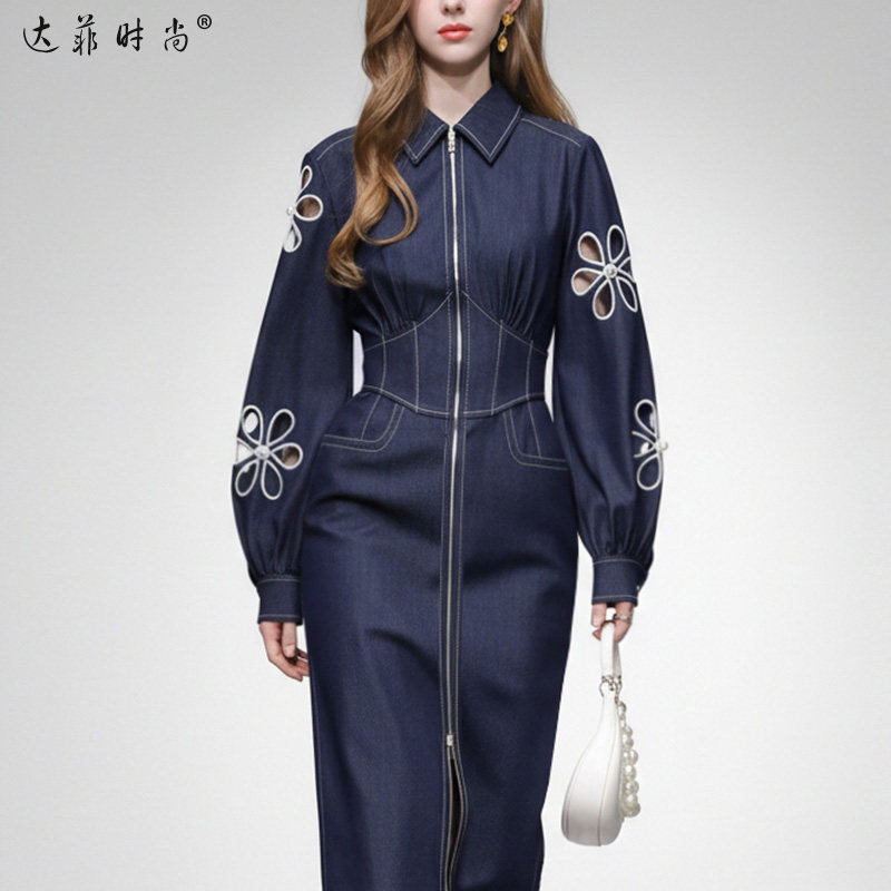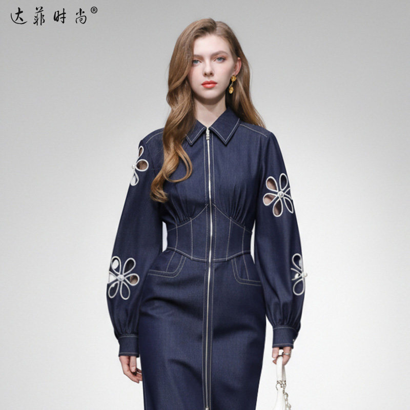 2026春季新款时尚千金风设计感镂空绣花灯笼袖收腰直筒牛仔连衣裙