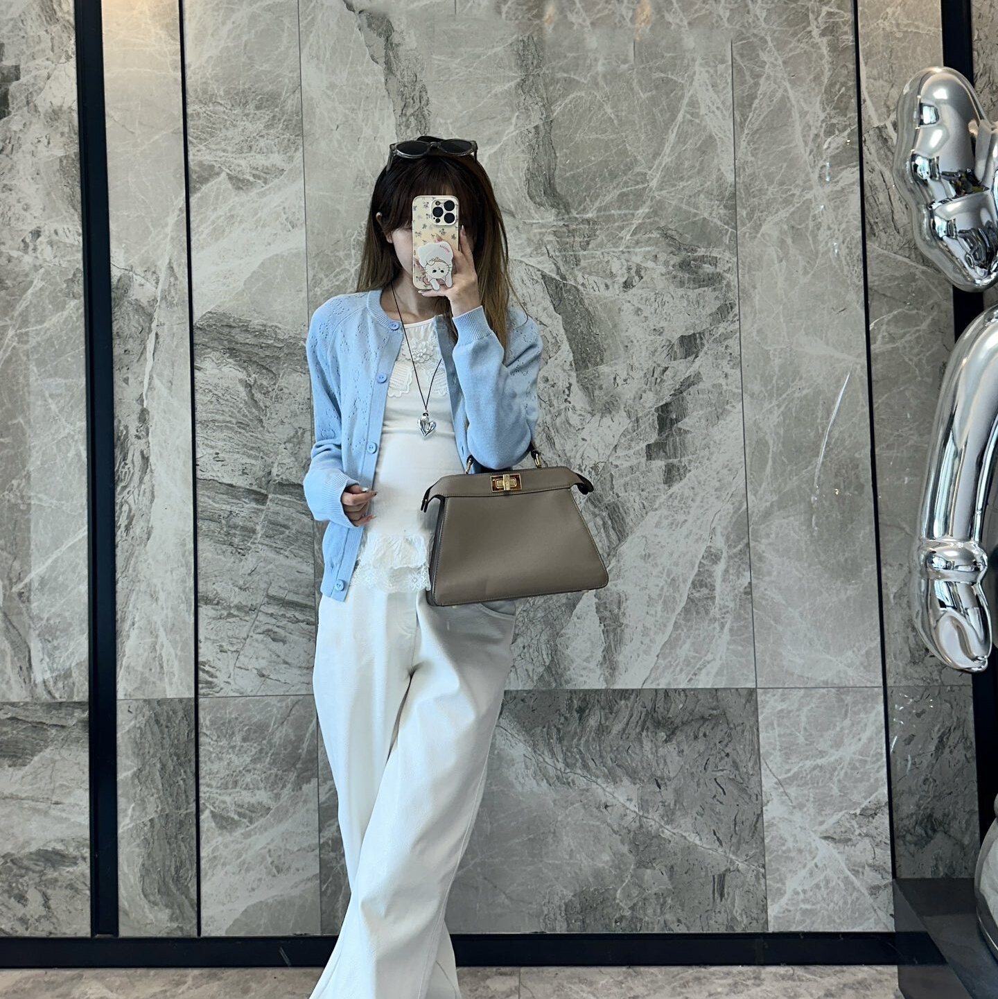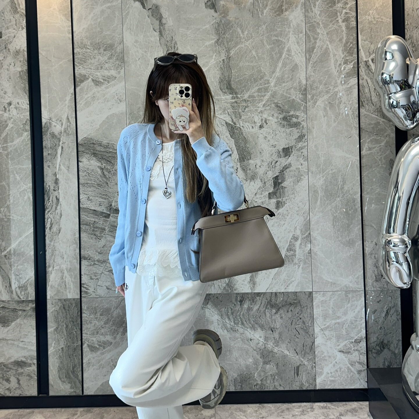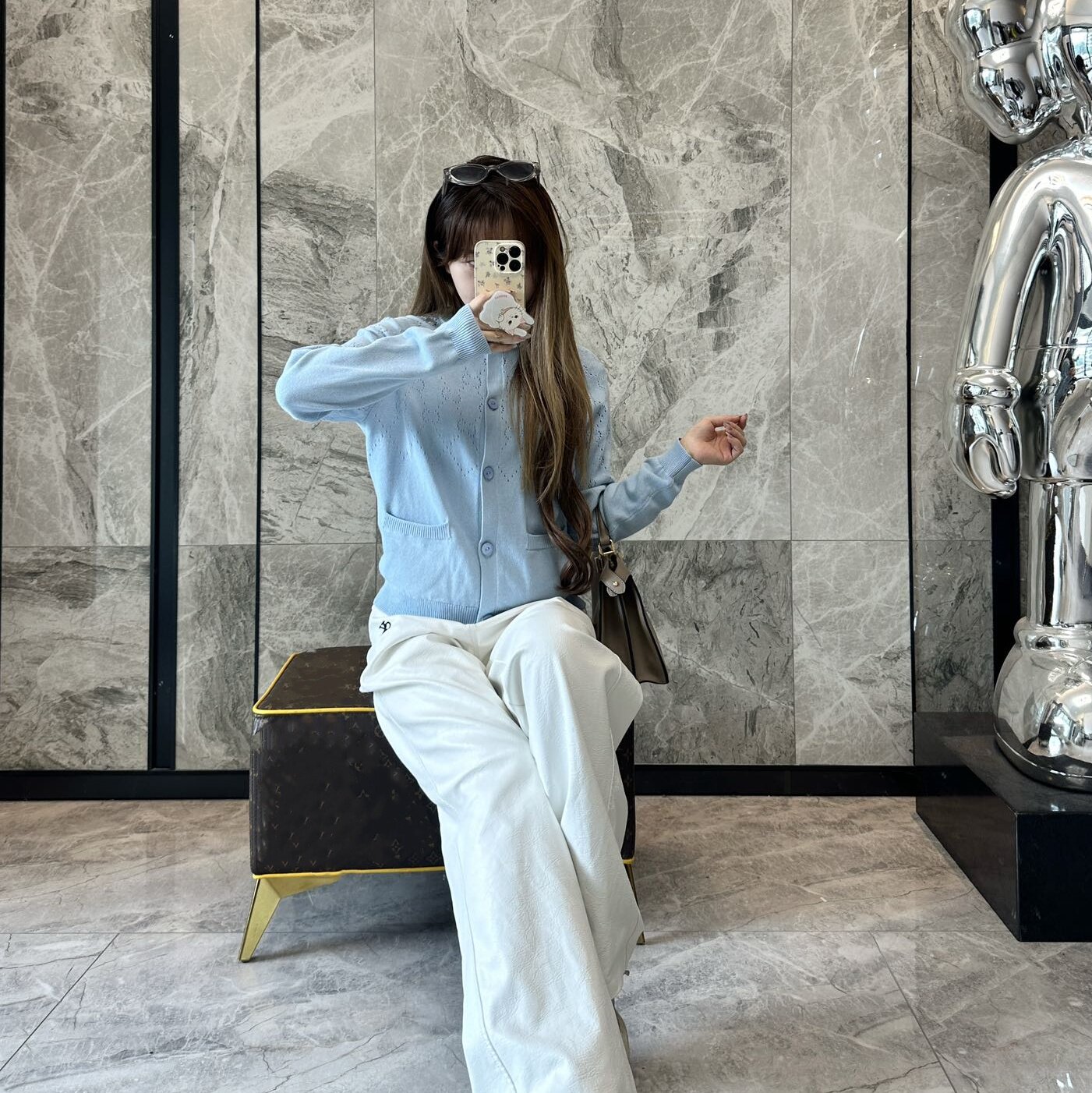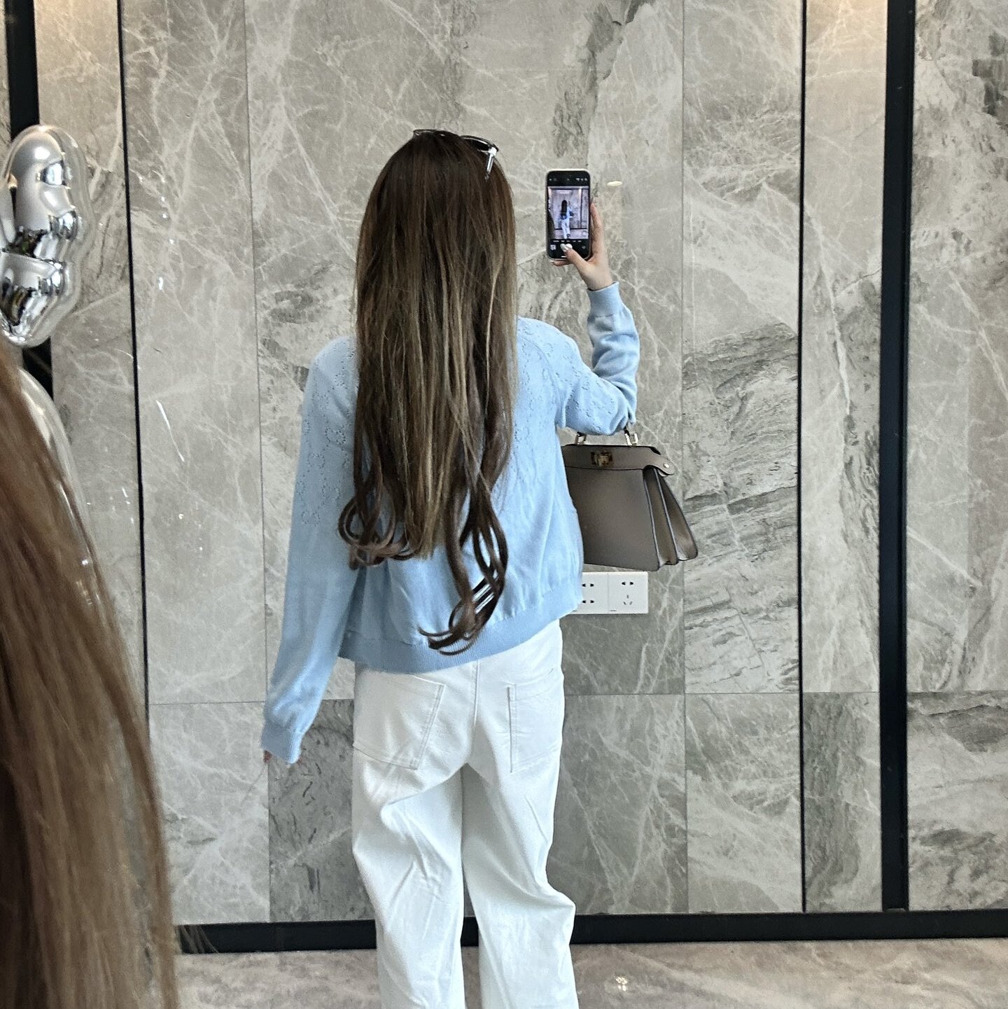 南油针织衫女早春2026新款浅蓝色圆领开衫字母镂空插肩袖毛衣外套