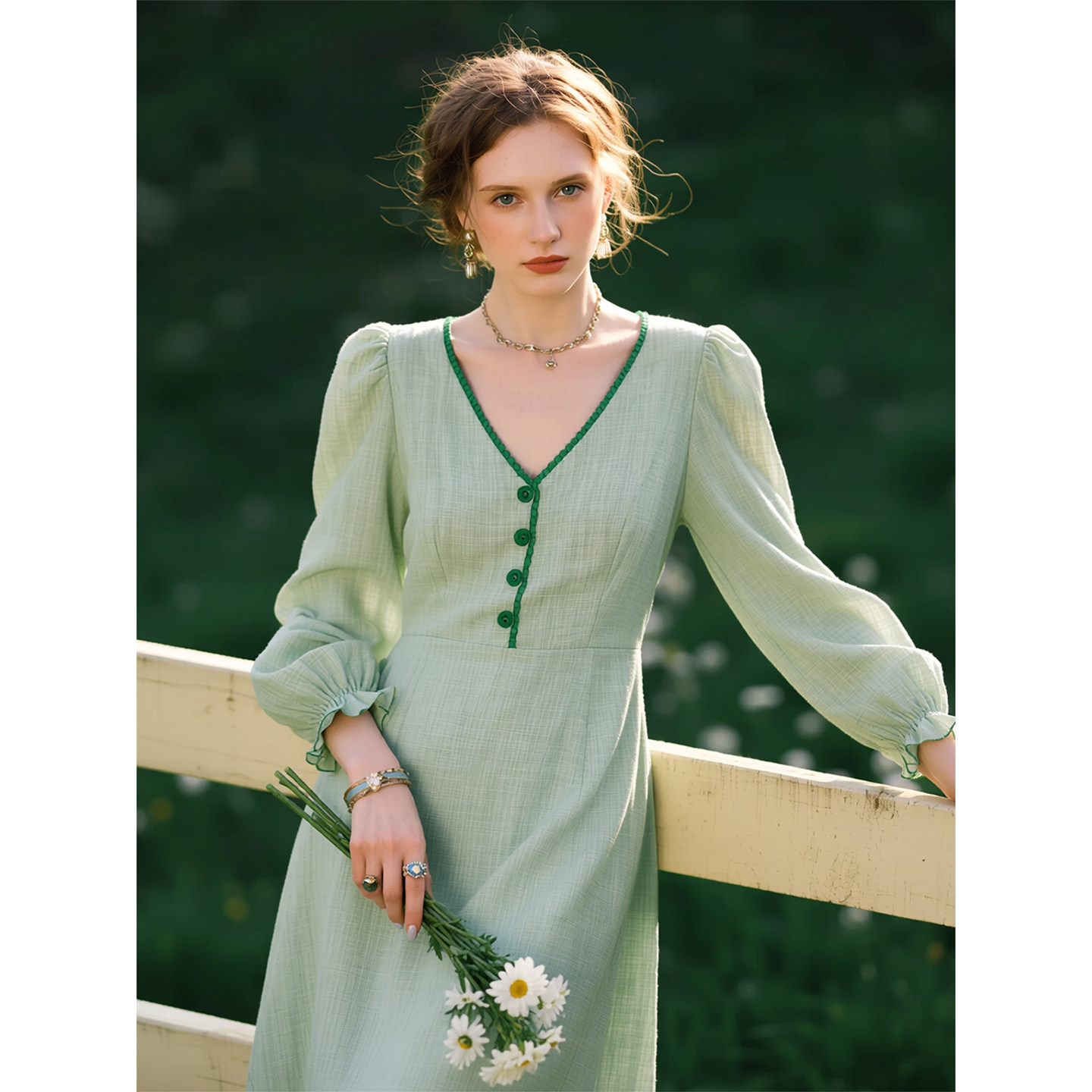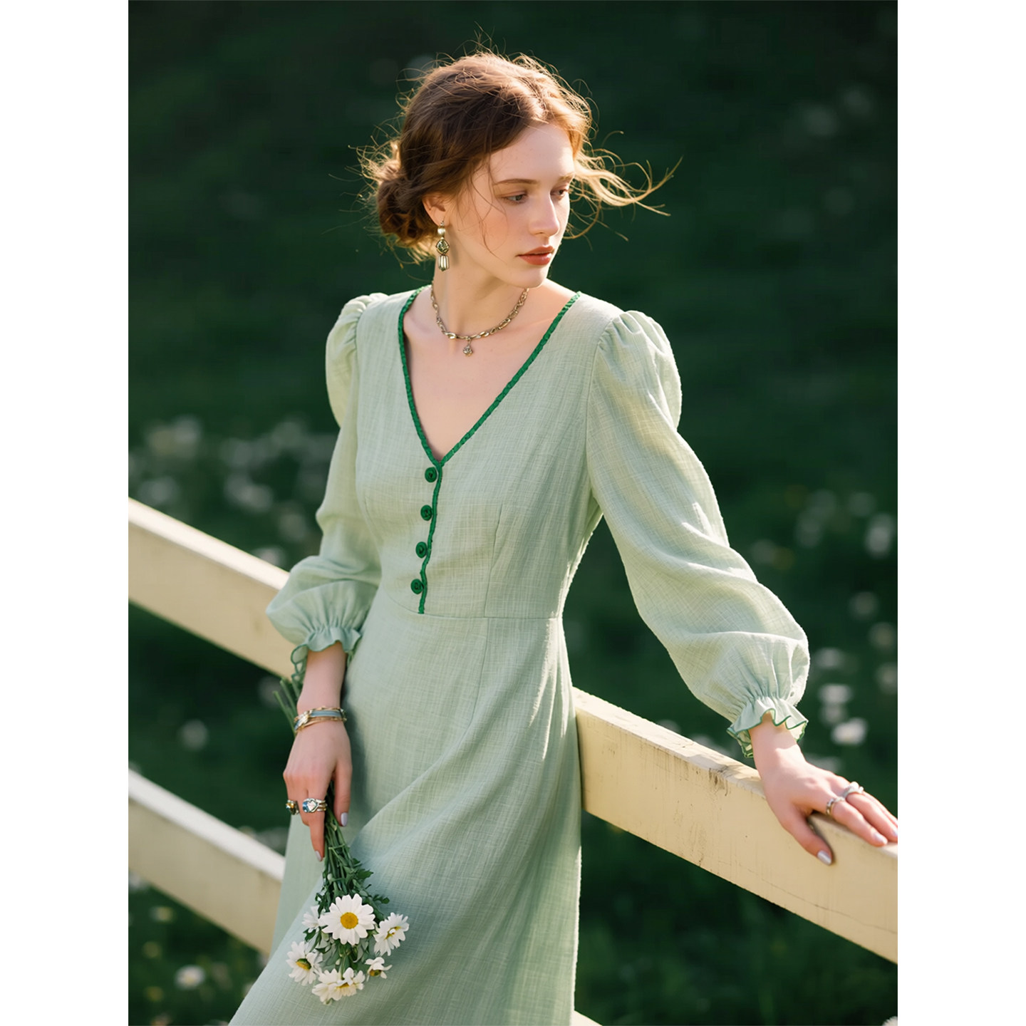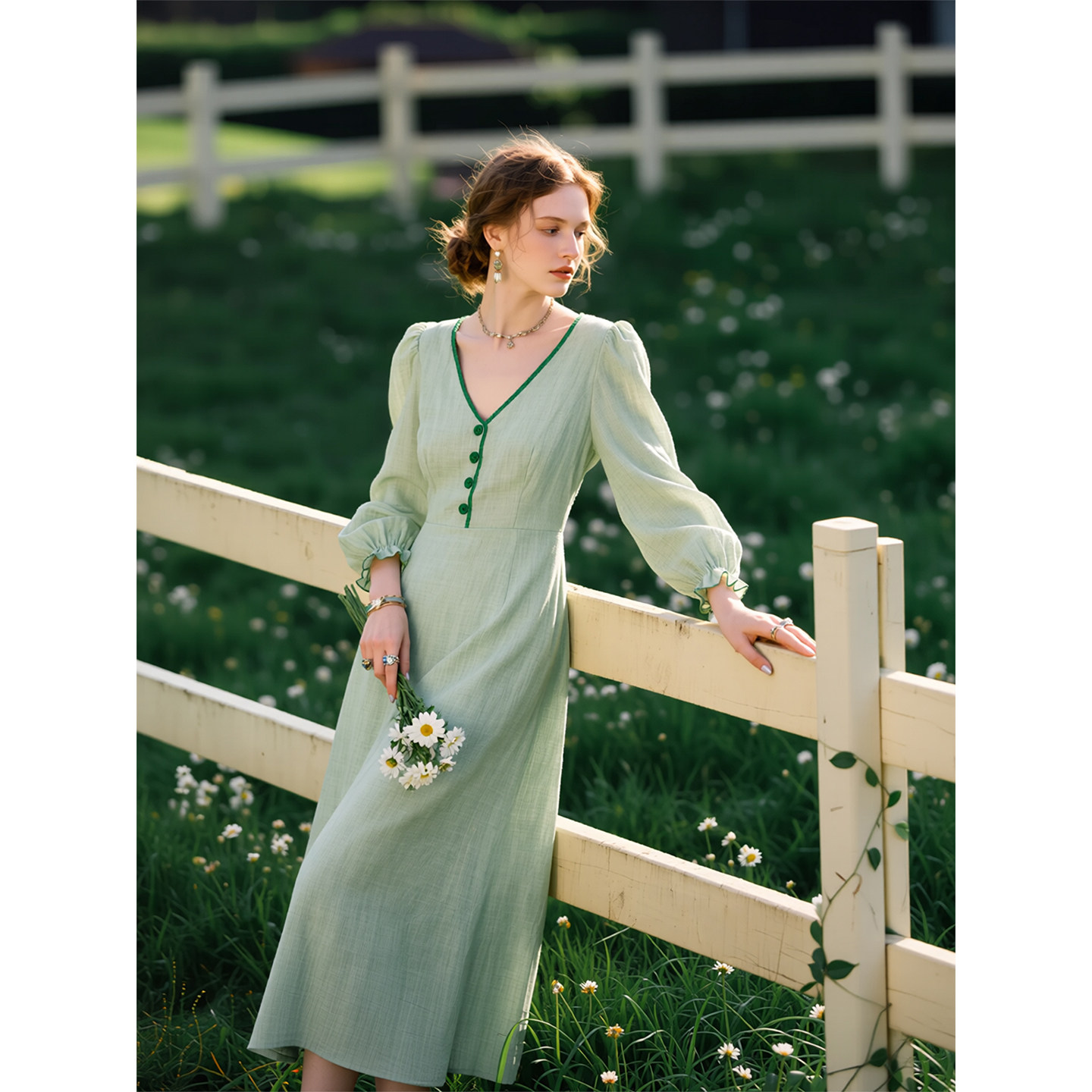 薄荷绿V领亚麻长袖连衣裙女2026年春季新款温柔风收腰显瘦长裙