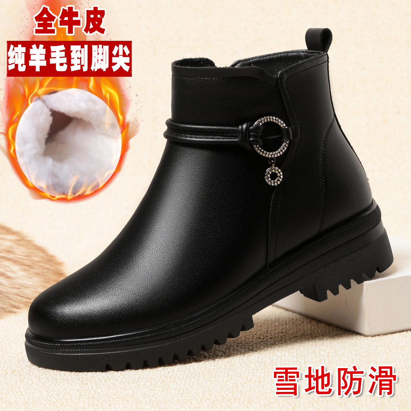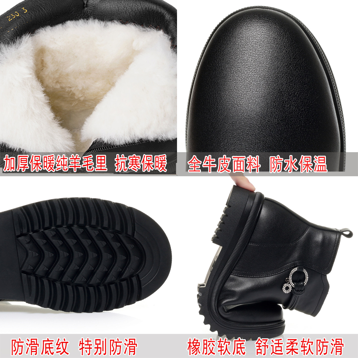 311线报网描述:全牛皮面料 加厚保暖纯羊毛 雪地防滑大厚底