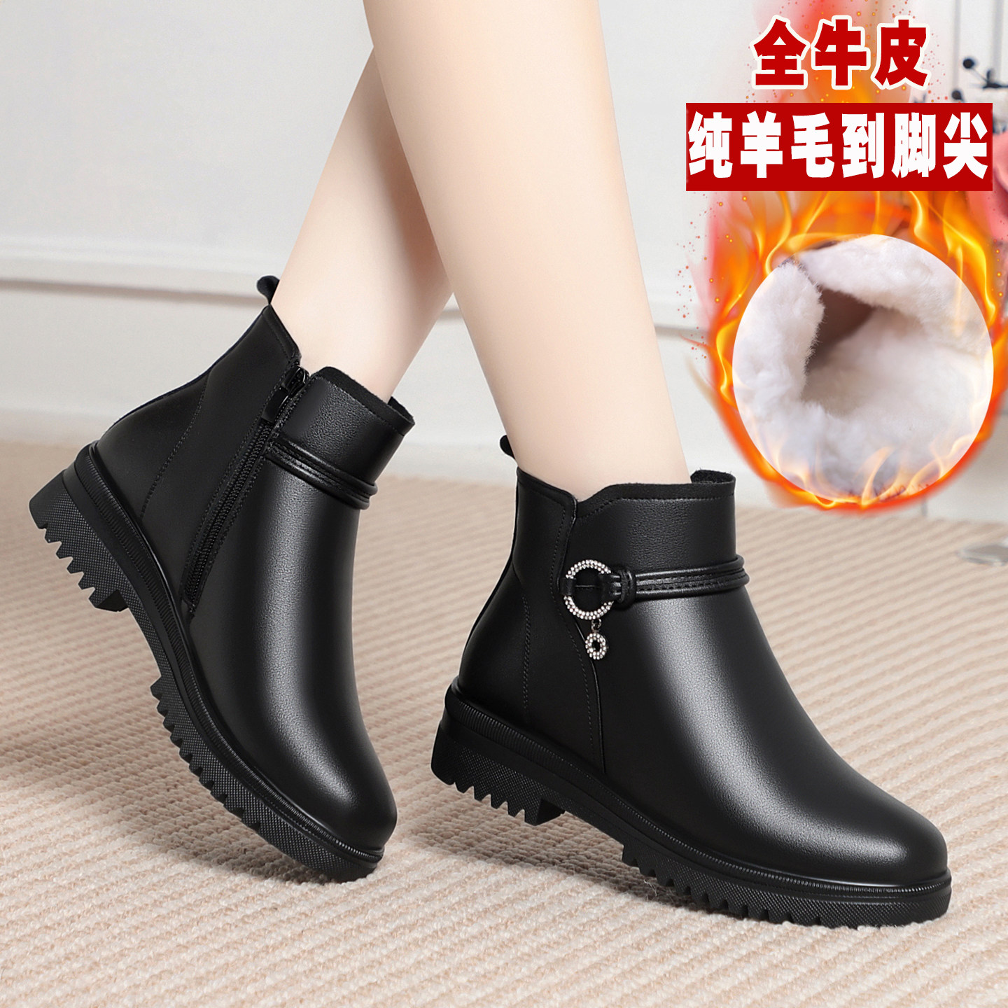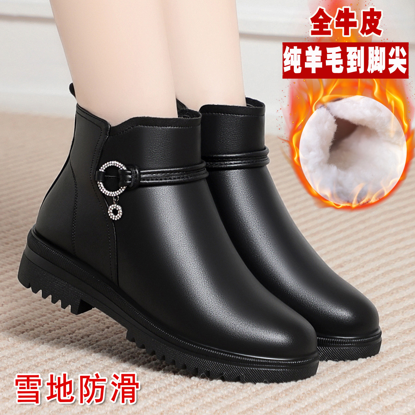 真皮妈妈棉鞋女款冬季女鞋子加厚靴子女士短靴软底羊毛皮鞋中老年