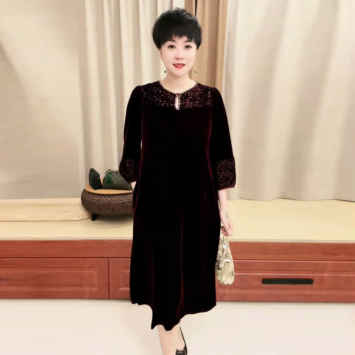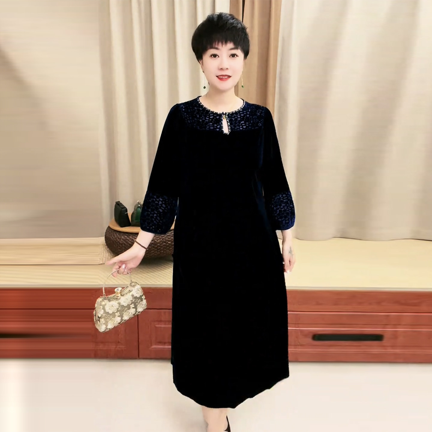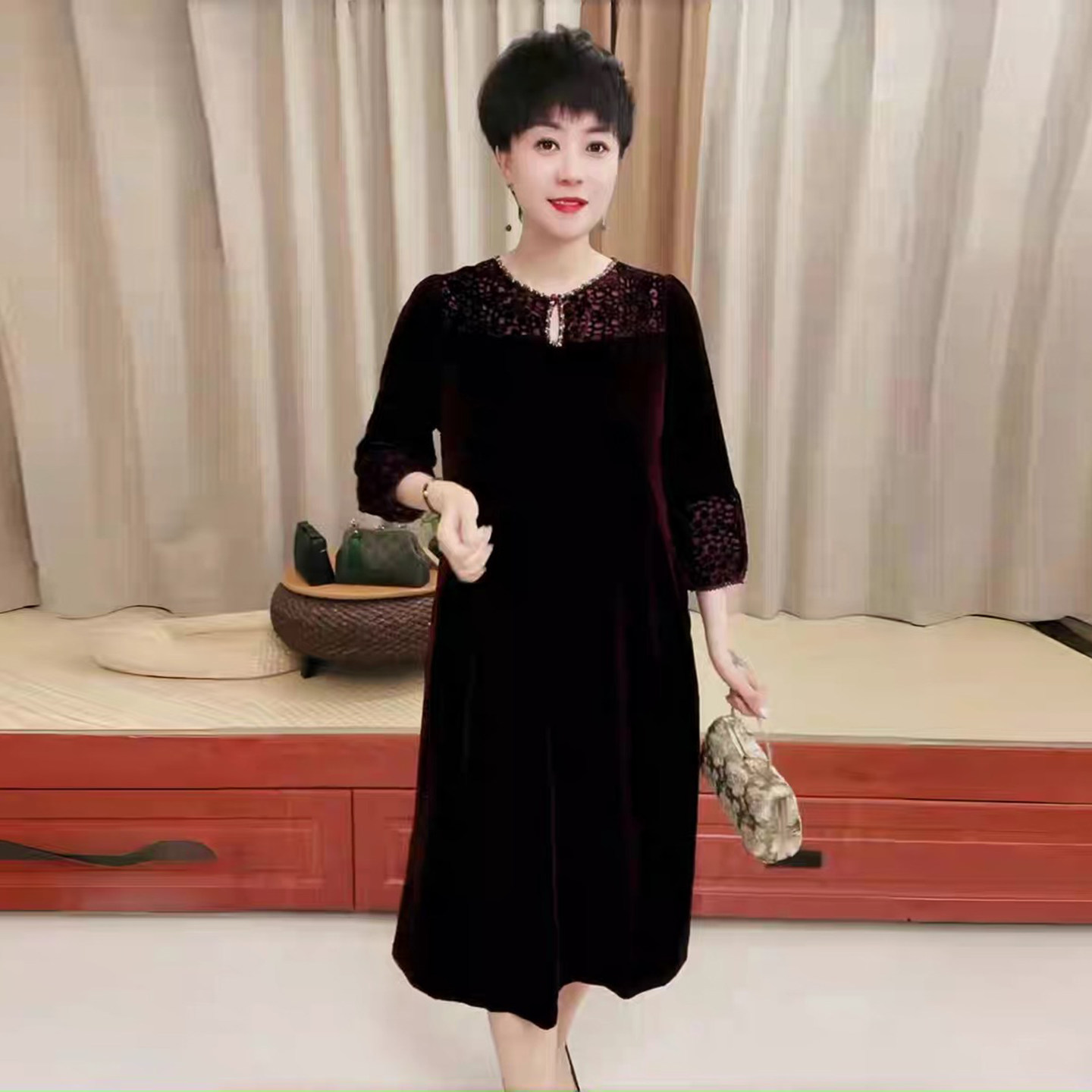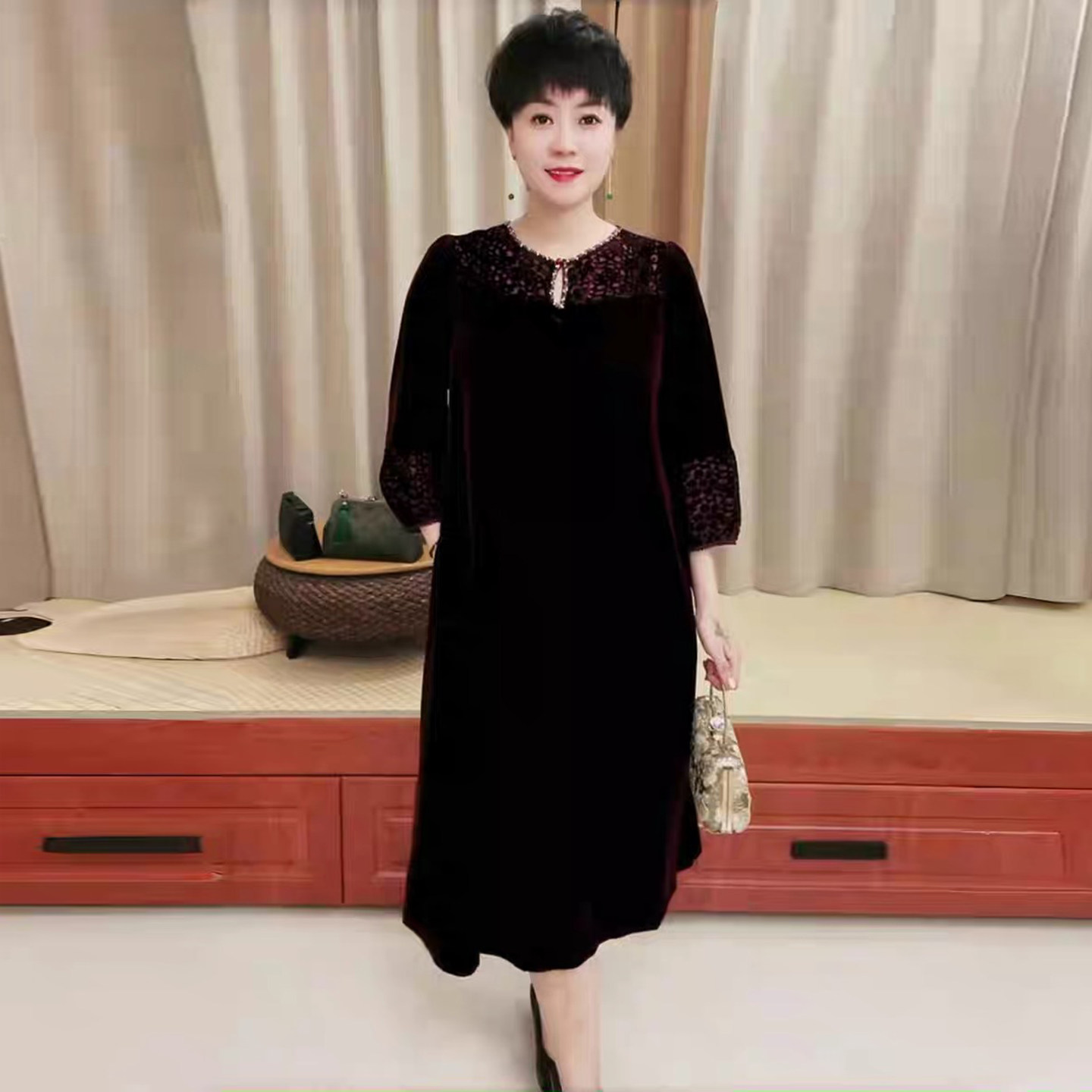 洋气妈妈丝绒钉珠连衣裙秋冬新款大码遮肚显瘦过膝长款烧花裙子女