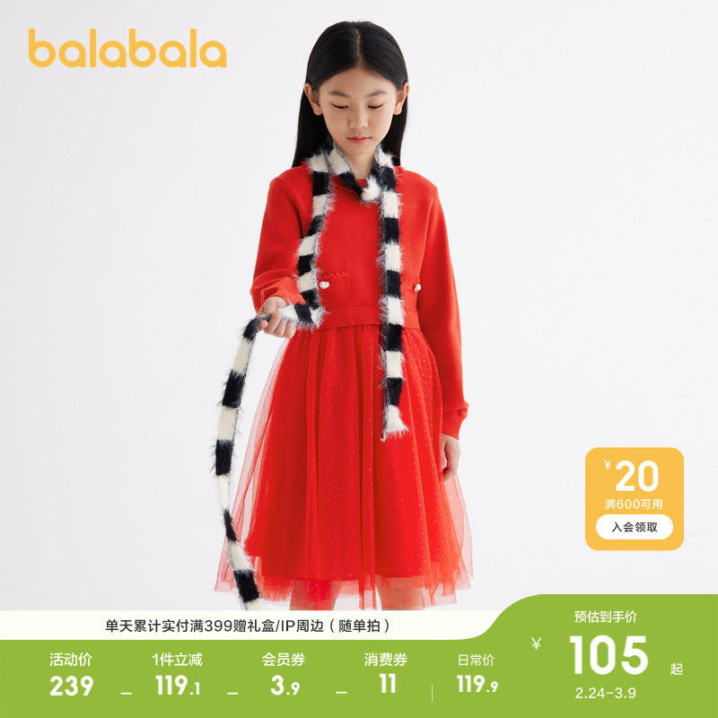 巴拉巴拉童装儿童连衣裙女童春秋装中大童洋气网纱公主红色拜年服