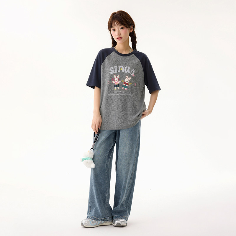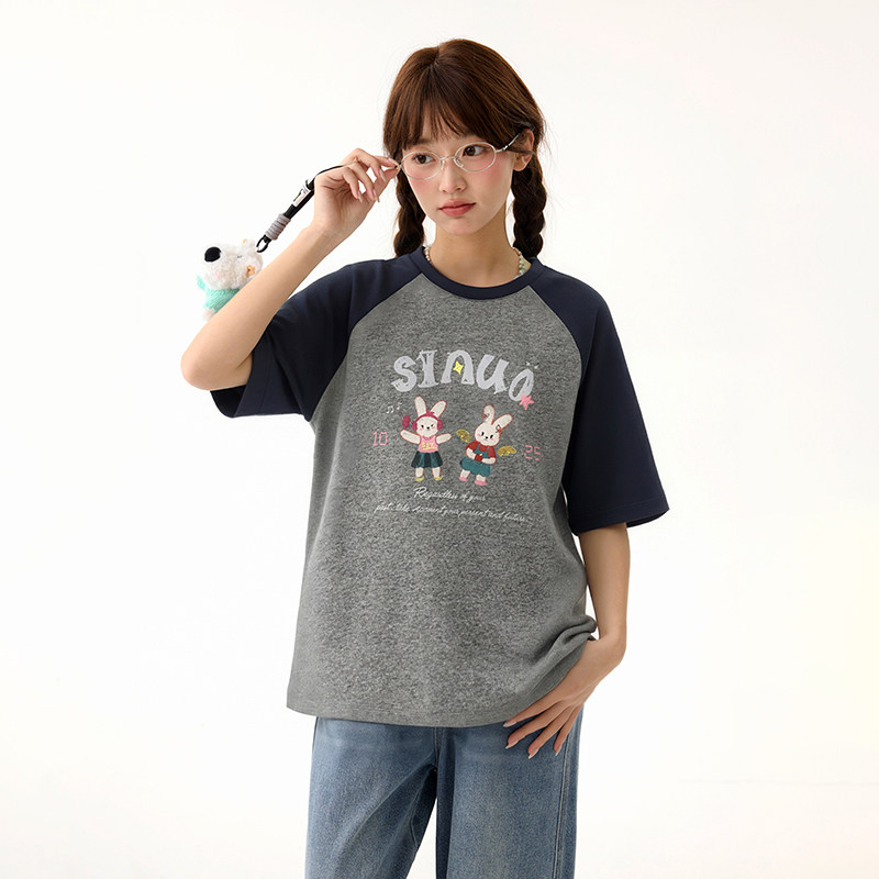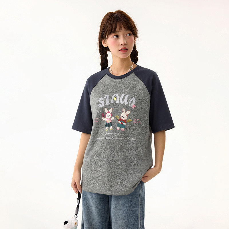 诺诺公主S1N初中生2026夏季卡通印花短袖T恤女青少年撞色圆领上衣