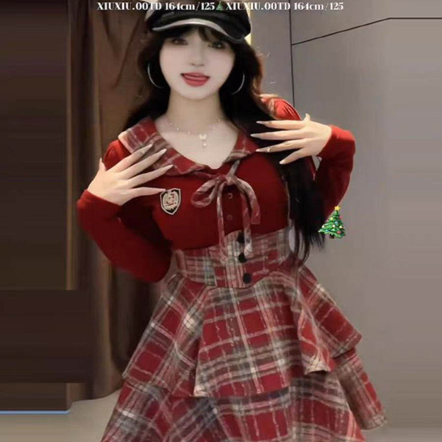 大码红色氛围感拼接连衣裙女秋冬胖mm显瘦长袖打底衫束腰裙两件套